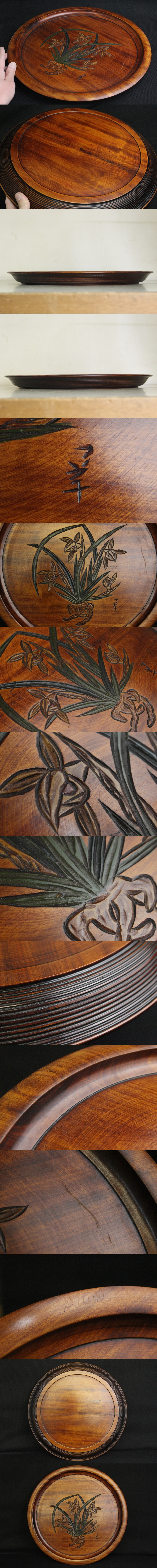 TB526讃岐彫 一峯 丸盆◇在銘/径約36cm/香川漆器/木製/漆塗/木彫/彫物/君子蘭/茶道具/茶盆/漆工芸/時代/骨董/古美術/古道具タグボート 收藏
