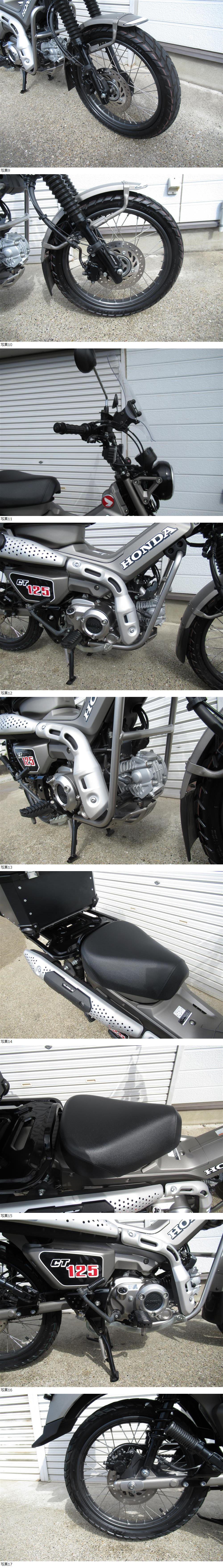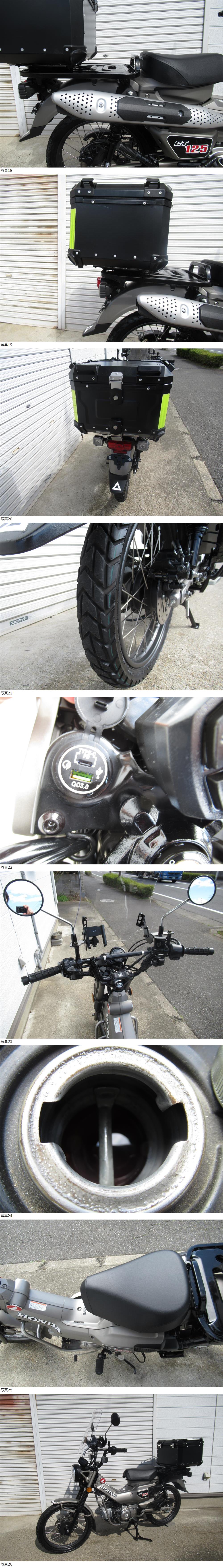 | 商品説明 | ホンダ CT125 ハンターカブ の出品です☆ ワンオーナー車、低走行2850KMです。☆ 千葉県中央地域より出品です。自走引取り可能です。名変後自賠責加入後にお乗りください。☆ エンジンの始動動画も下記にありますので、ご検討中の方はよければご確認ください。☆ 商品詳細 メーカー:ホンダ 車名:CT125 ハンターカブ 初度登録年式:令和6年4月/2024年4月 車体番号:JA65-101※※※※ 登録書類:有(廃車証明書) 走行距離:2846KM エンジン;実動 状態:現状車 鍵×2本(メイン、シート同一) リヤボックスキー×2 U字ロックキー有 □□□カスタム□□□ □ウインドシールド □リアボックス □USB充電ポート(Type-A &Type-C) バイクショップにて点検記録有:令和8年3月14日 すべてメンテナンスノートに記載あり R8年3月14日 エンジンオイル交換 2823キロ時点 同上:ブレーキオイル交換 同上:ドライブチェーン注油 走行テスト済み、走る止まる曲がる一切問題なしです。バイクショップにて点検済みで即乗り可能です。☆ ☆☆☆CT125 エンジン始動動画はこちら☆☆☆ ☆☆☆CT125 エンジン始動動画はこちら☆☆☆ ※動画はグーグルでパソコンでご確認ください。 エンジンはセルにて始動し、エンジン好調です。異音や白煙もなしです。☆ ライトトリムカバーに傷すこしへこみあります。駐車時に倒してついた傷です。走行中の転倒は一切ありません。☆ 使用による小傷小錆程度はありますが、比較的状態のいい車両になります。現状有姿渡しです。☆ 乗車前点検後にお乗りください。☆ |