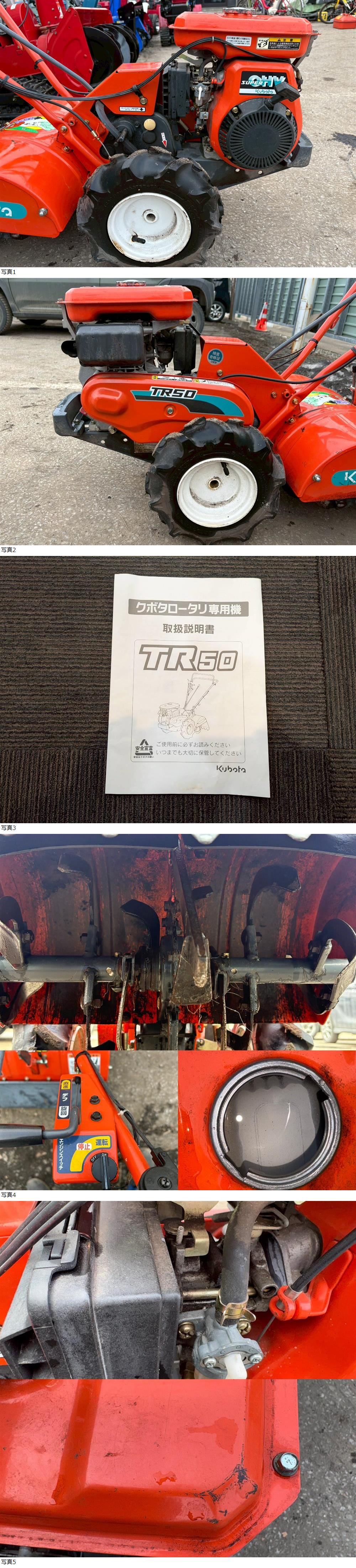 ●クボタ 耕運機 土の助 ミニ TR-50 ★始動・動作OK! ★リバース付き! ★取扱説明書 メーカー :クボタ 車体番号 :10575 型式 :TR50 燃料 :ガソリン 始動方式 :リコイル ミッション :前2後1 サイズ 全長:140cm 幅53cm 高さ106cm ・各部キズ、サビ、汚れ等あり □■□コメント□■□ クボタ 歩行型耕運機 TR50 出品します!!! 状態は上記にある通りですが当方、専門店ではないため 動作・欠品・破損等の説明不足はあるかもしれませんのでご理解の上ご入札ください! 実演は行えておりません。あらかじめ状態は写真にて確認下さい。 現状渡しとなりますので、神経質・完璧を求められる方はご遠慮下さい。 中古品が気にならない方のご入札をお待ちしております!!! 出品場所:北海道北見市