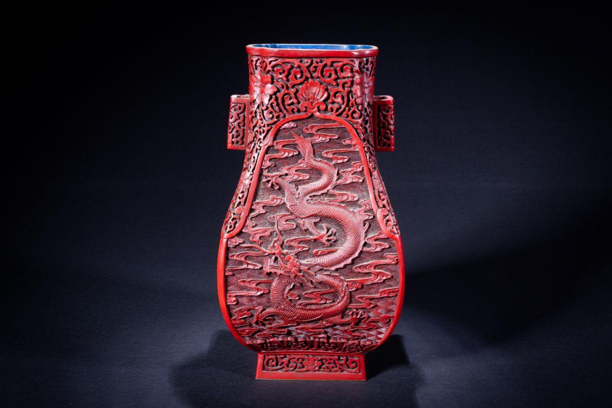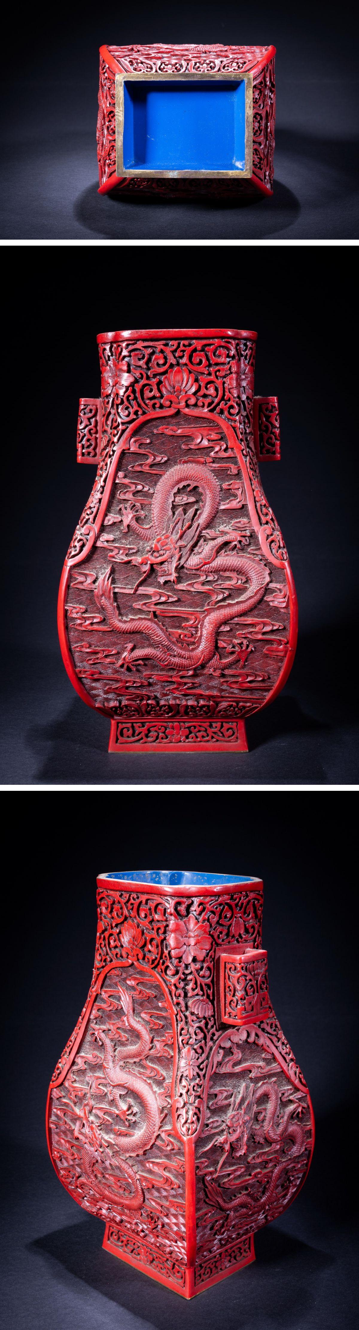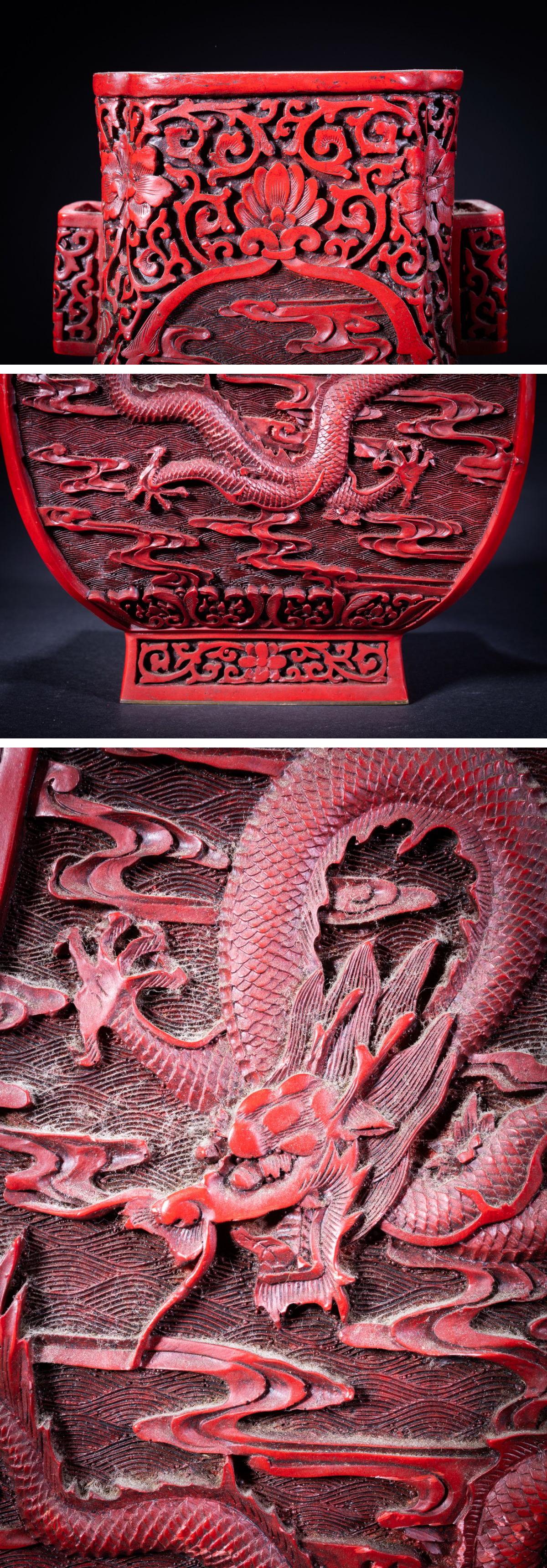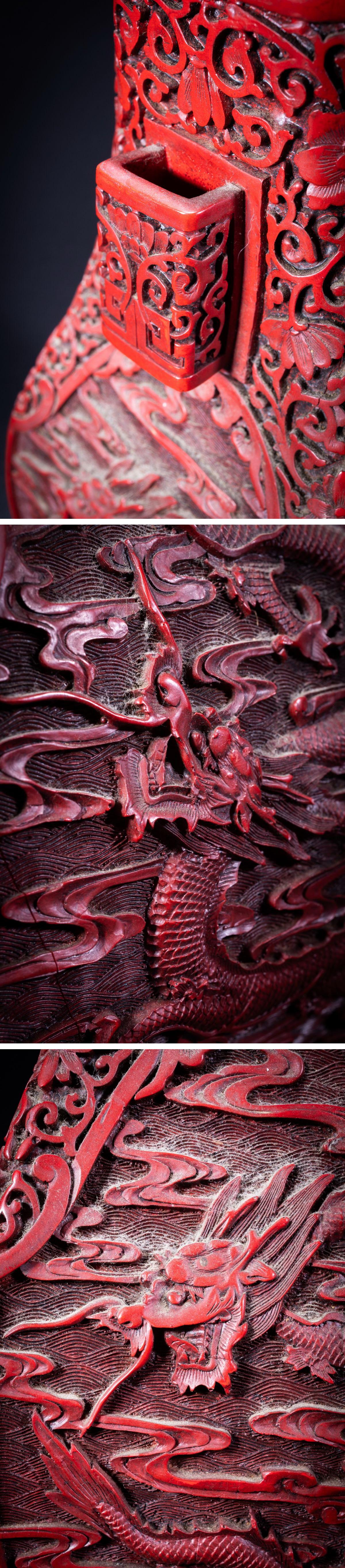 【珍品堂】1円から 堆朱 花瓶 龍彫 中国美術 堆黒 堆朱 飾壺 壺 骨董品 時代物 H14.3cm WK10-79 收藏