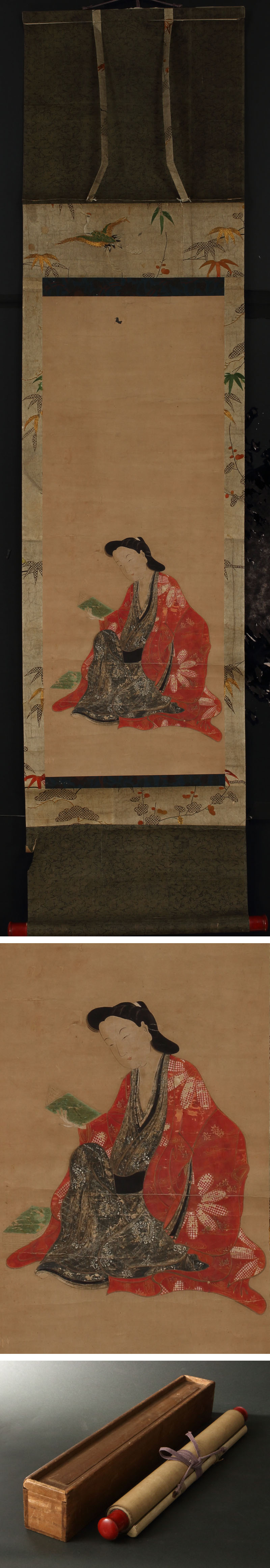 【模写】委託HK◇時代 美人読書図竪物(掛け軸 肉筆浮世絵 古画 美人画 遊女図 菱川派 江戸絵画 文殊菩薩 小袖裂表具) 收藏