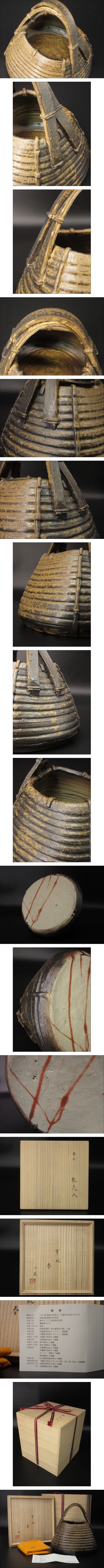 森一洋 「備前 籠花入」高さ25cm 共箱 寒風窯 細密細工の優品 2008年頃の作 父森陶岳 收藏