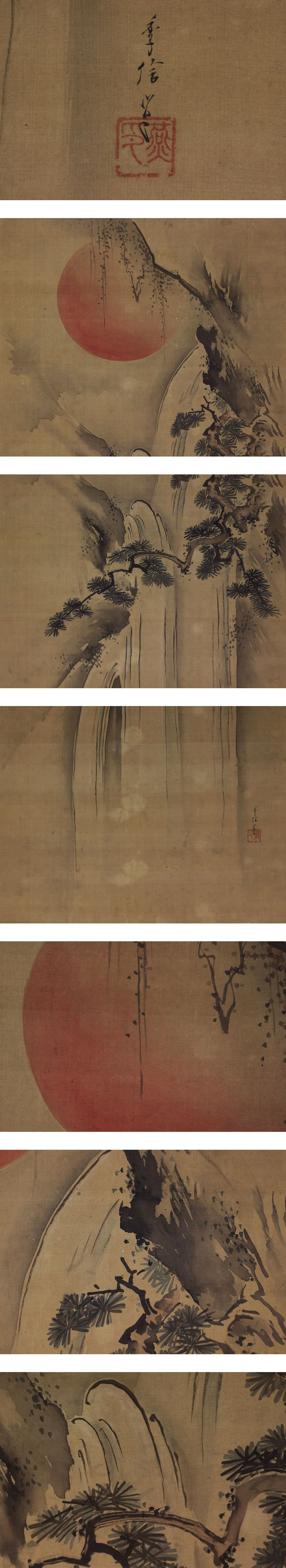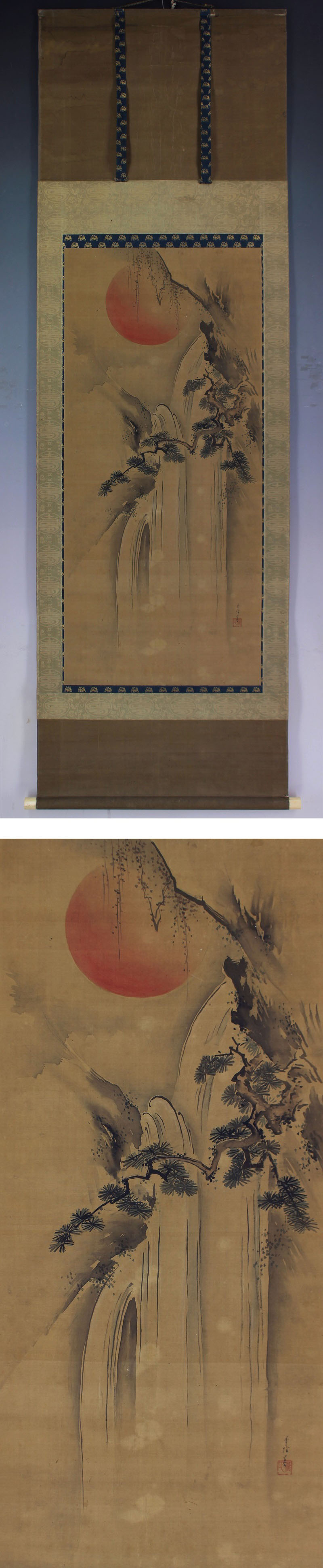 狩野玉燕 かのう-ぎょくえん(1683-1743) 江戸時代前期-中期の画家。 天和(てんな)3年生まれ。2代狩野休伯の3男。兄休碩の養子となり,元禄(げんろく)14年(1701)下谷御徒士町(おかちまち)狩野家をつぐ。寛保(かんぽう)3年8月21日死去。61歳。名は季信。 本紙は、シミ、汚れ、折れ、シワ、ヤケ、時代感があります。 表装は、経年によるシミ、汚れ、折れ、シワ、破れ、虫食い、スレ、軸先に汚れがあります。 【サイズ】 作品 横約 47.5cm×縦約 106cm 表装 横約 61cm×縦約 196cm |