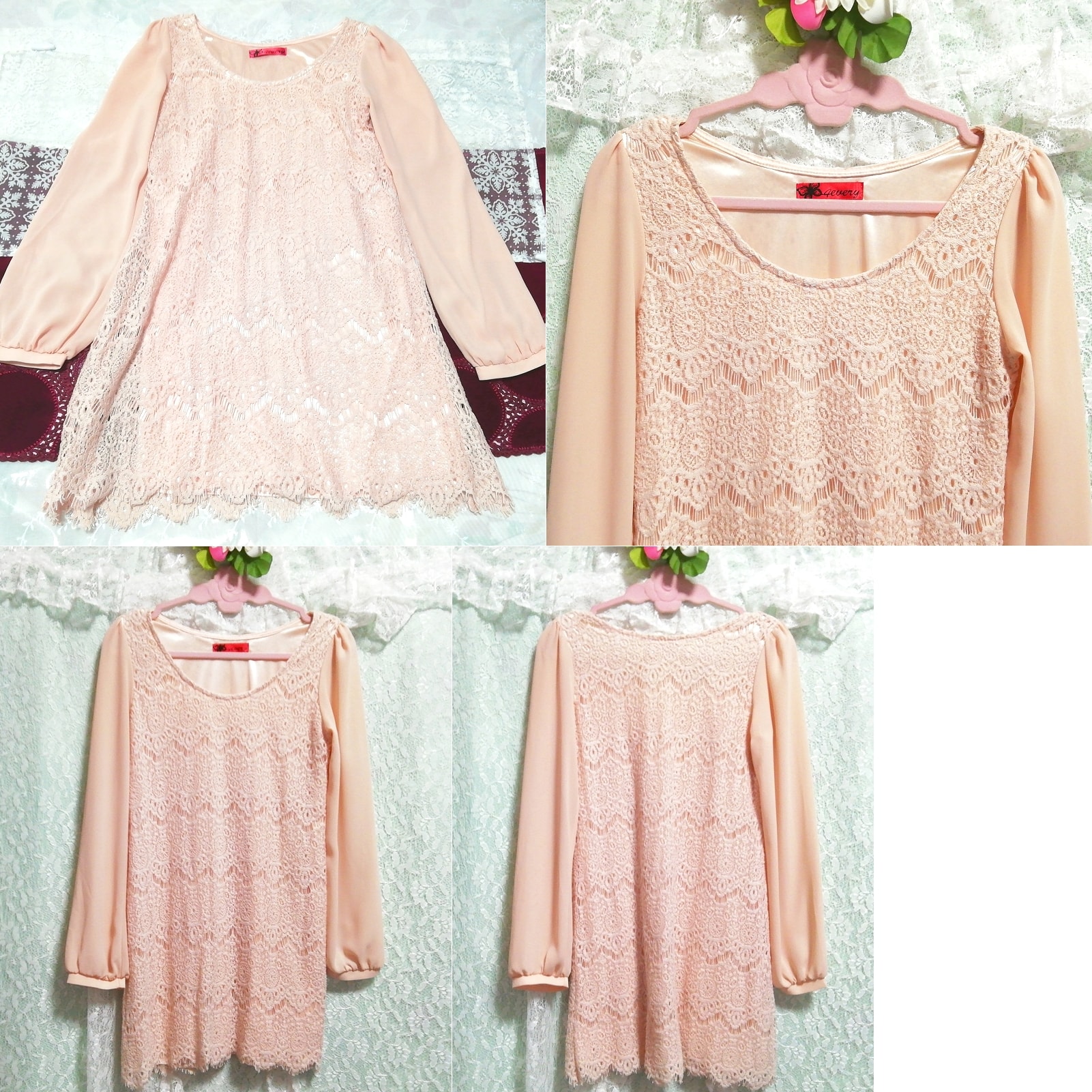 ピンクレースシフォン長袖チュニックネグリジェ Pink lace chiffon long sleeve tunic negligee dress 收藏