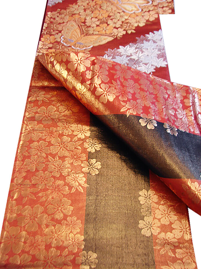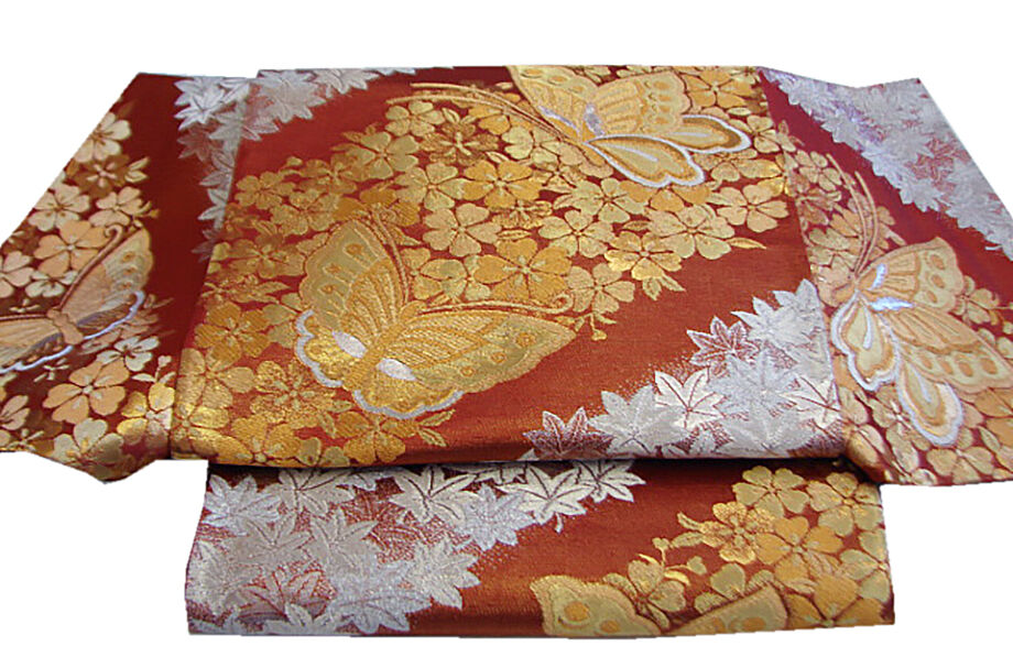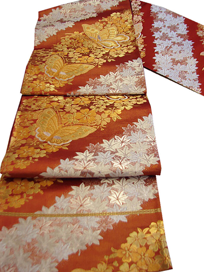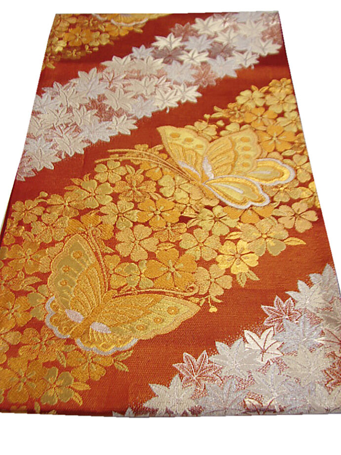 | 商品説明 | とてもしなやかで扱い易く〆易い重厚感溢れる西陣織の袋帯。 樺色地に金糸や銀糸の花や蝶の織柄。 裏地は樺色地に墨色の太縞に金糸の花の織柄。 六通柄。 |