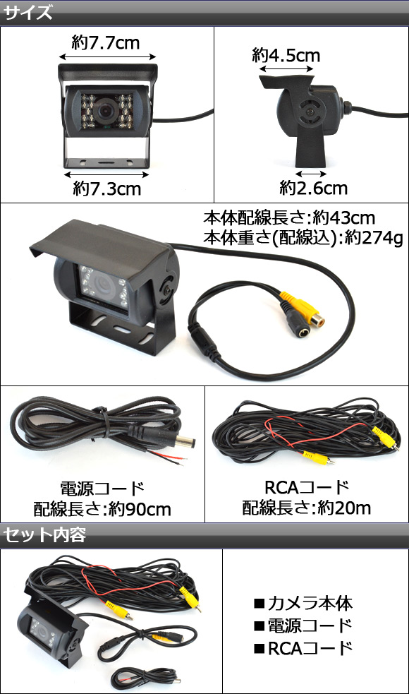 AP CMOSバックカメラ 鏡像 12~24V RCA配線20M 暗視用赤外線LED AP-CMR-005-B-20 收藏