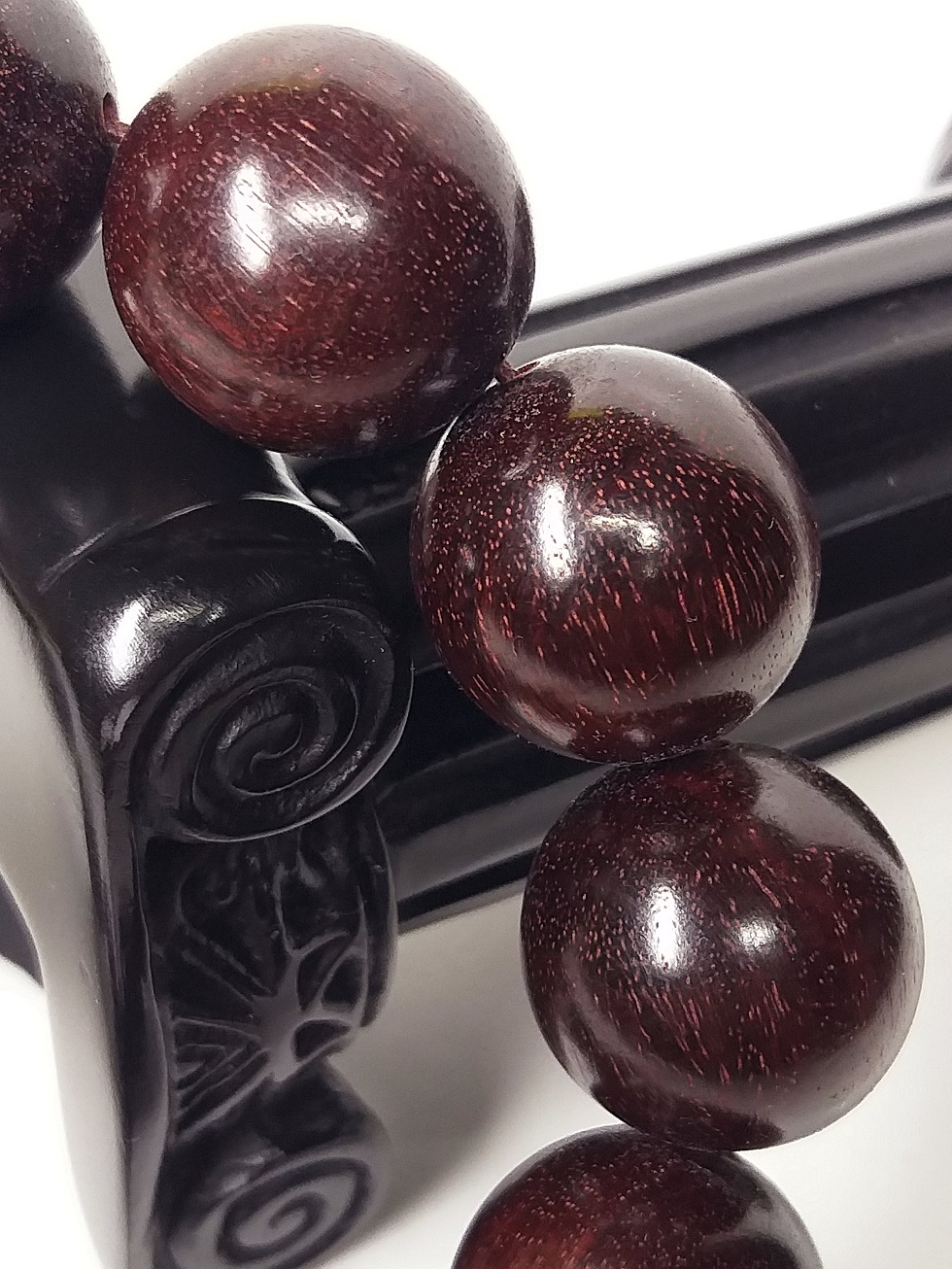 このひとさしの腕輪念珠は、合計13粒(天然最高級極珍品特大粒インド野生小葉金星紫檀主玉11玉+天然最高級極珍品特大粒インド野生小葉金星紫檀親玉1玉+天然最高級極珍品特大粒インド野生小葉金星紫檀ボサ1玉)により構成されています。贅沢な天然最高級極珍品特大粒インド野生小葉金星紫檀珠玉による全仕立てになっております。最極上質品の腕輪念珠です!