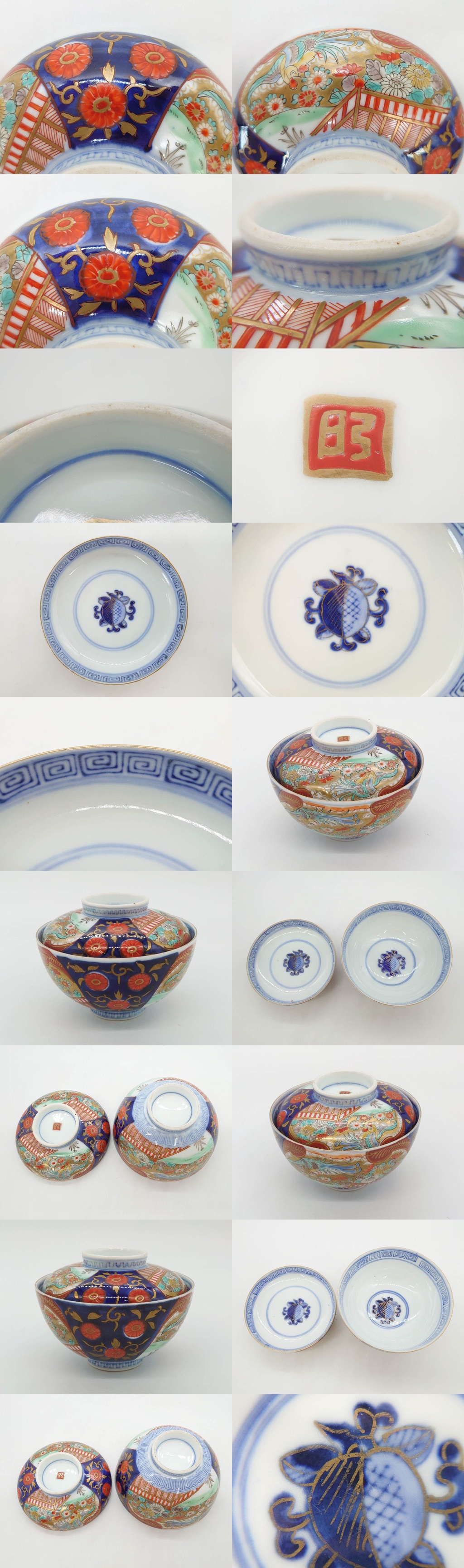 R-077412 明治期 伊万里焼 色絵 桃印 鳳凰菊雷文 約12cm 4.1寸 蓋付き茶碗3客セット(金彩、器、どんぶり、和皿、和食器、四寸一分) 收藏