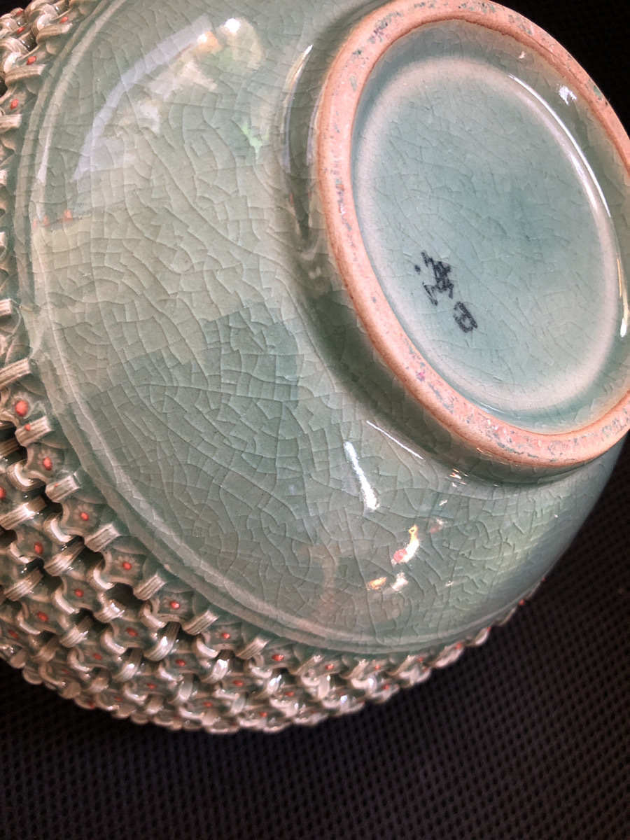 【舞鶴青磁花器柳昌坤作 】海日傳統陶藝 透かし 壺 高麗青磁 韓国・外箱付属品無し【24/11 STUD】 收藏