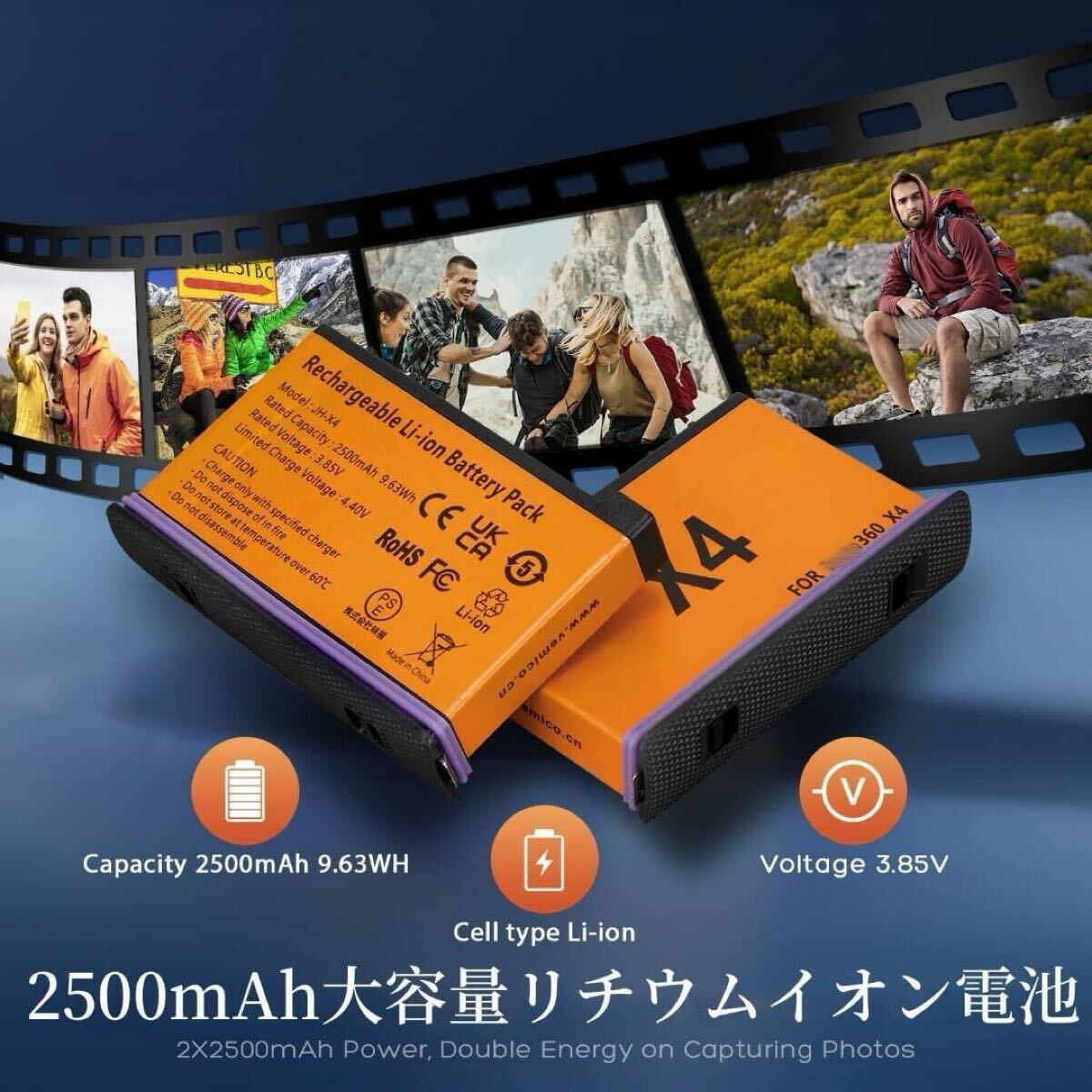 【360 X4 バッテリー】360 X4 純正バッテリーと100%互換性があります。 容量: 2500mAh、電圧: 3.85V 。高品質なリチウム電池を採用して、数回以上の繰り返し充電が可能です。(360 X4 カメラに完全対応できます。ご注意:バッテリー非防水!)
