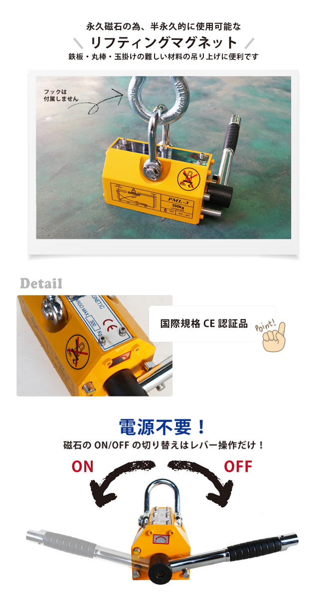 ●磁石のON/OFFは単純レバー操作により行い電源不要、ONの状態はロック付きの安全設計 ●非鉄金属や、吊り荷が無い状態では磁石を使用出来ません ●肉厚15mm以上で75%の能力を発揮し25mm以上で100%に達します ●鉄板・丸棒・玉掛けの難しい材料の吊り上げに便利 |