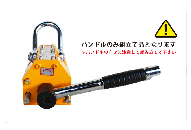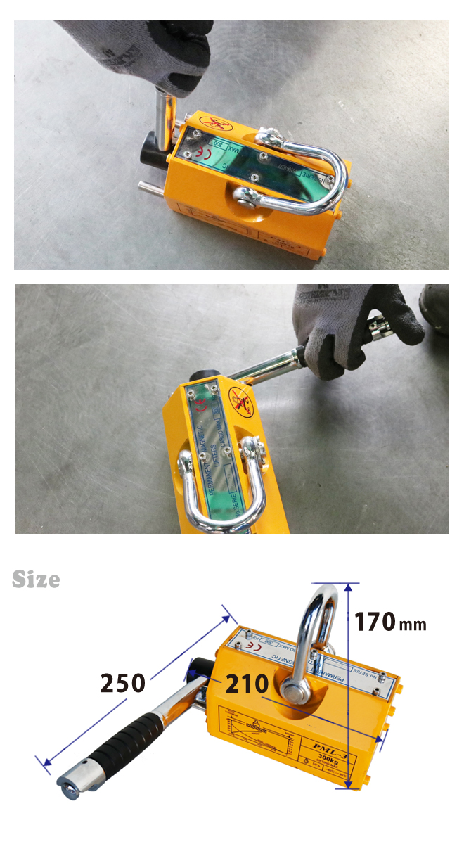 ▼使い方 1.吊り上げようとする対象物の上(重心)にマグネットを静かに置く 2.レバーをONにする 3.対象物をゆっくりと地切する程度に吊り上げる 4.木などの棒で対象物をたたいて離れないか様子を見る 5.大丈夫なようならば吊り上げて静かに移動させる |