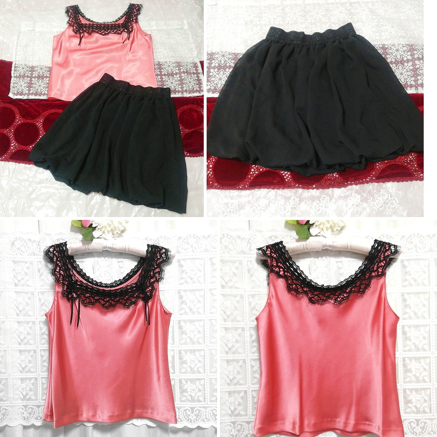 サーモンピンクサテン光沢タンクトップ黒レースネグリジェ 黒シフォンミニスカート 2P Salmon pink satin gloss tank top black lace negligee chiffon mini skirt