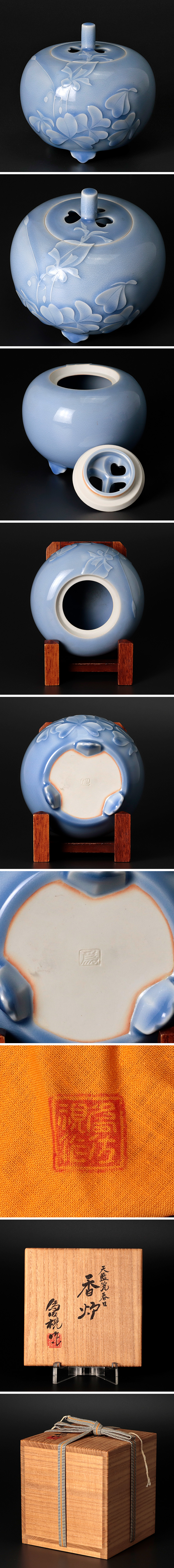 美しい淡い青色の釉薬が特徴的で、優雅で静かな雰囲気を漂わせています。春日香炉の繊細な形状と、細部にわたる丁寧な造りは、まさに職人の技が光る一品です。天藍瓷の特徴である透明感のある釉薬が、光の具合によって微妙に変化し、見る者に静かな美しさを感じさせます。また、香炉としての機能性を備えつつも、そのデザインが和の空間をより一層格調高いものにしており、インテリアとしても非常に魅力的です。