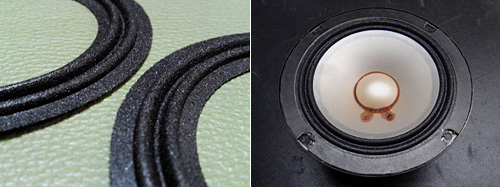 お使いのスピーカーのエッジは大丈夫ですか? まだ音が鳴っているとはいえ、エッジが劣化しているユニットをそのままの状態で鳴らし続けますと、 ボイスコイルを傷め、その後コイルが切れてしまい、最後には完全に鳴らなくなってしまいます。 低音が歪み、使用出来なくなったスピーカーを この機会に復活させてください! |