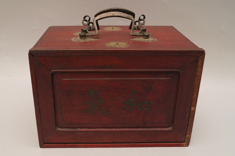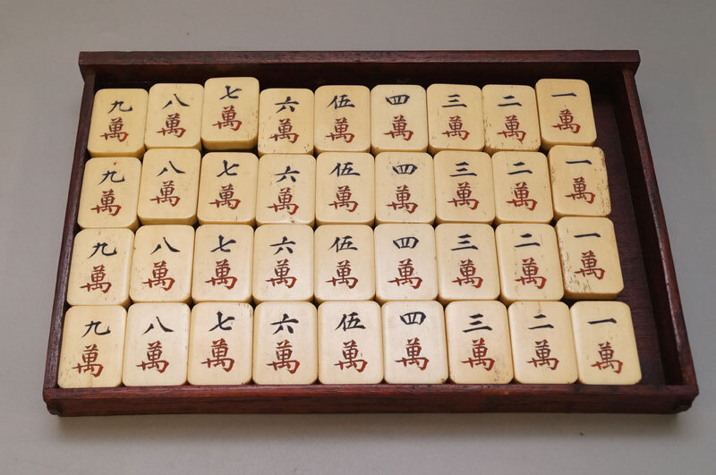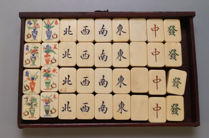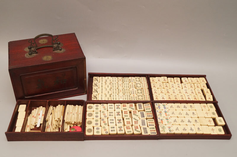 骨製背竹造麻雀牌 時代唐木彫刻箱付 中国美術 象牙風-482