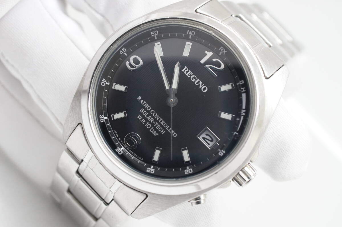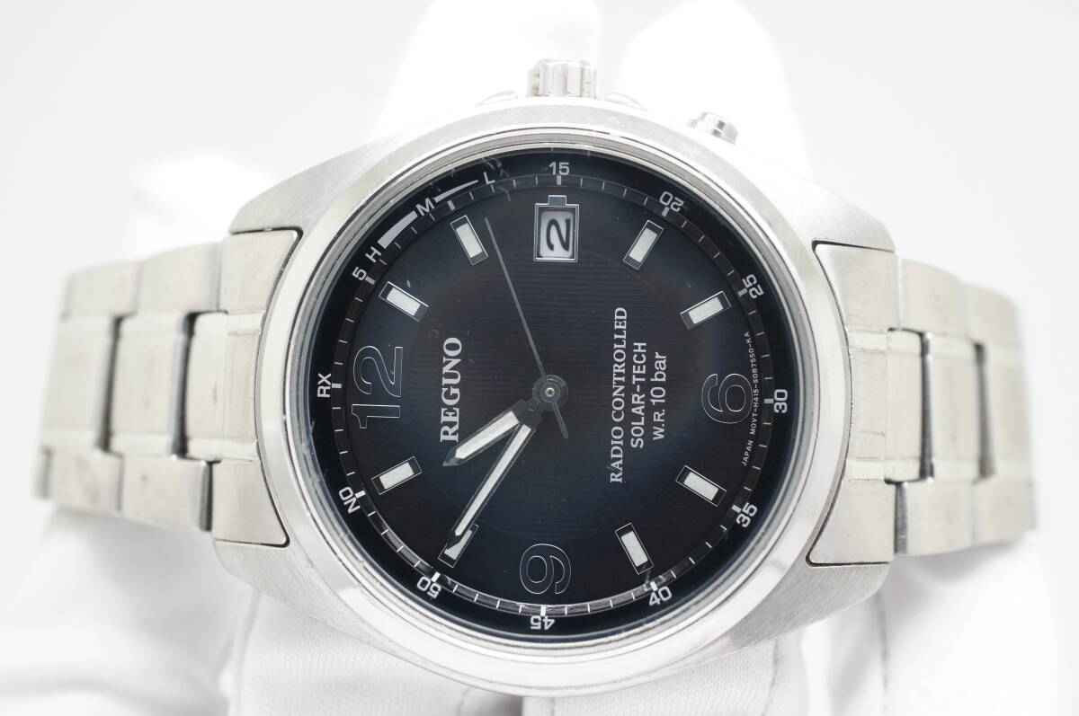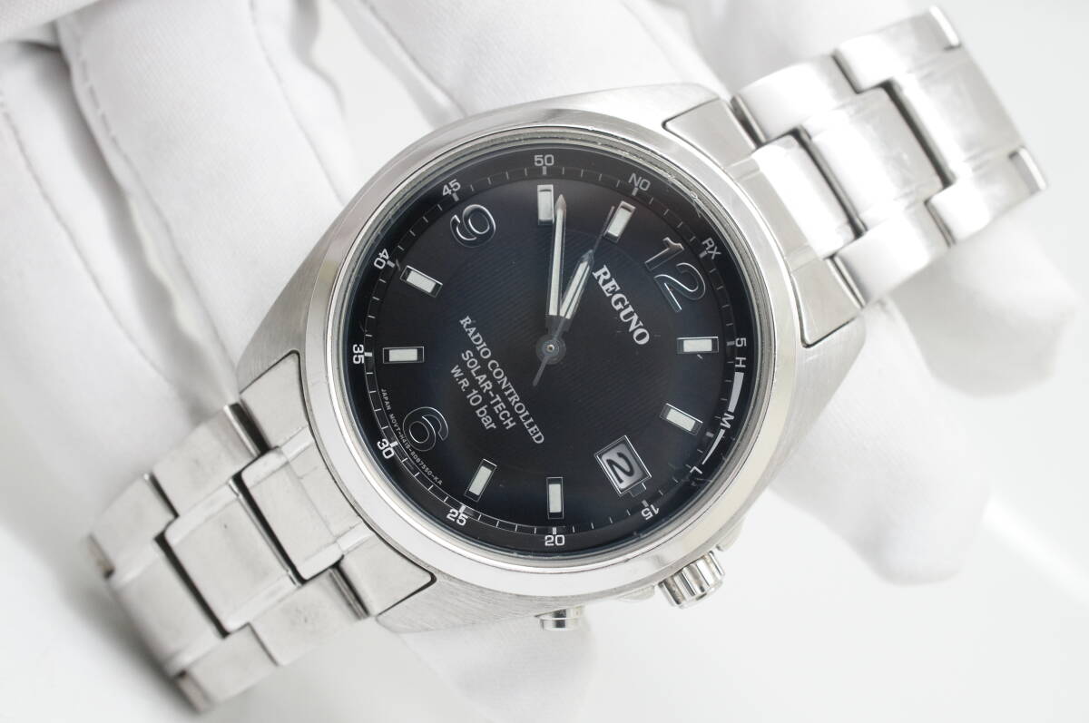 G20●作動良好 CITIZEN シチズン REGUNO レグノ H415-S057515 電波ソーラー デイト 黒文字盤 メンズ腕時計 シルバー お洒落 收藏