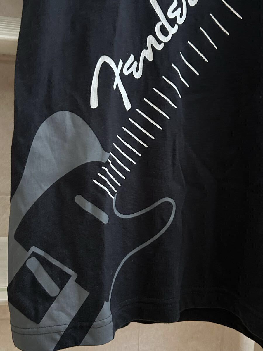 フロント部分にフェンダーギター、左袖にギターピックのプリントがあります。
