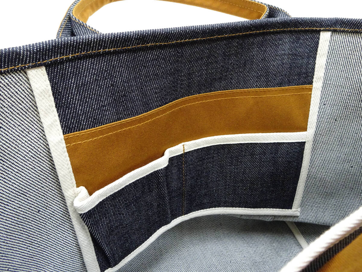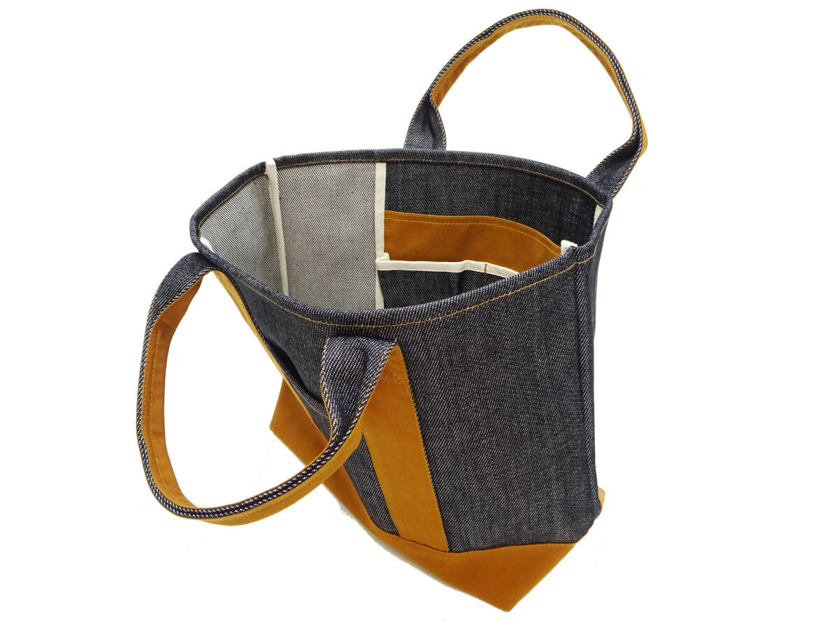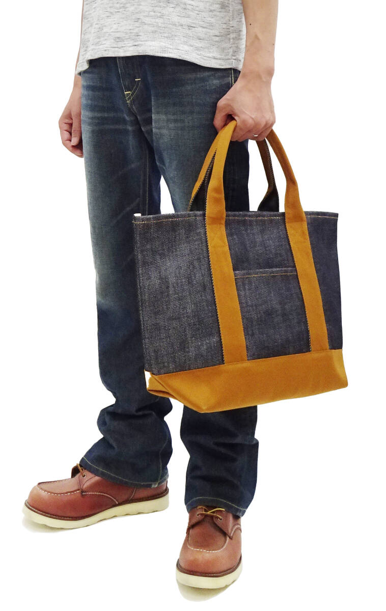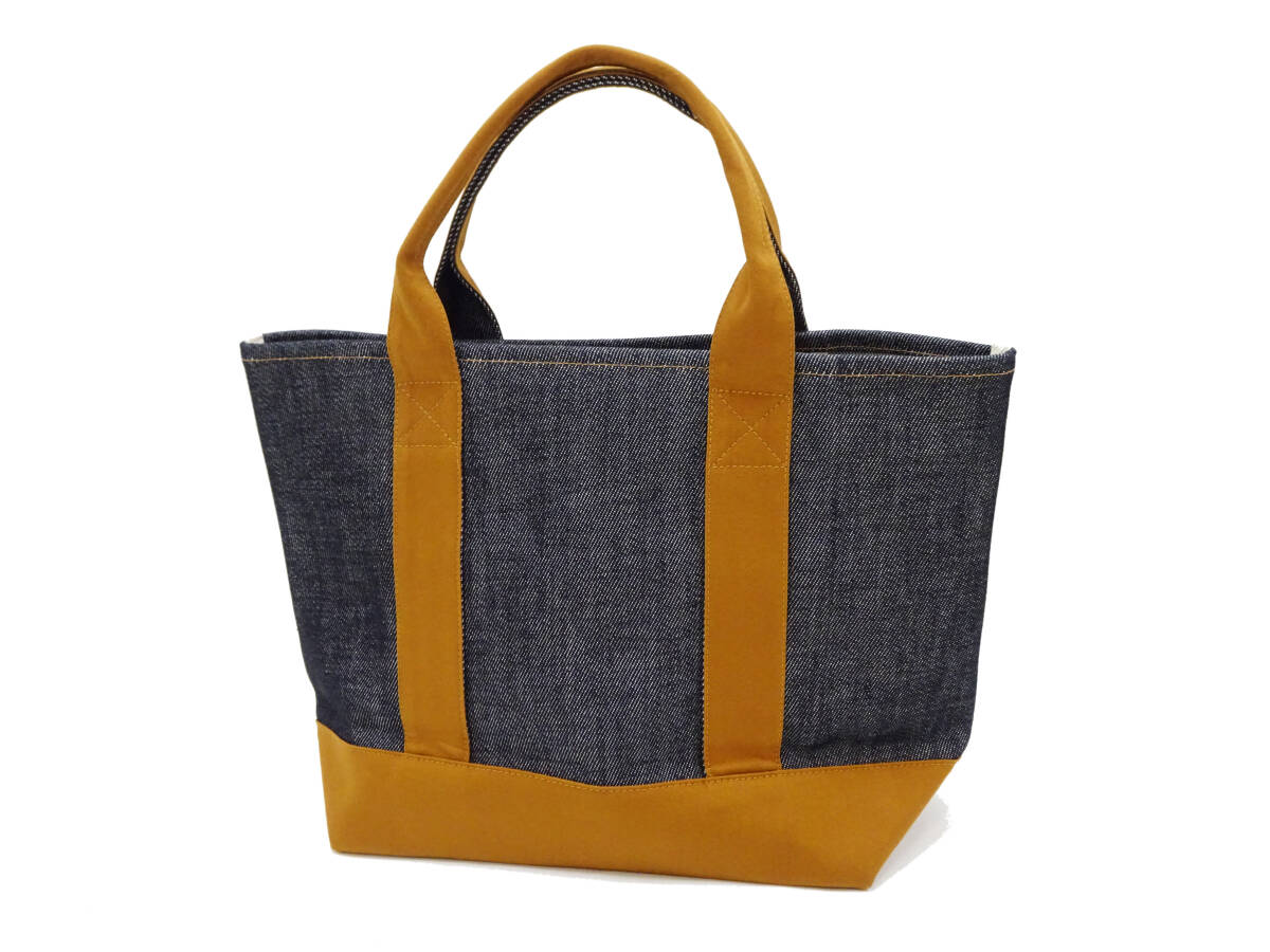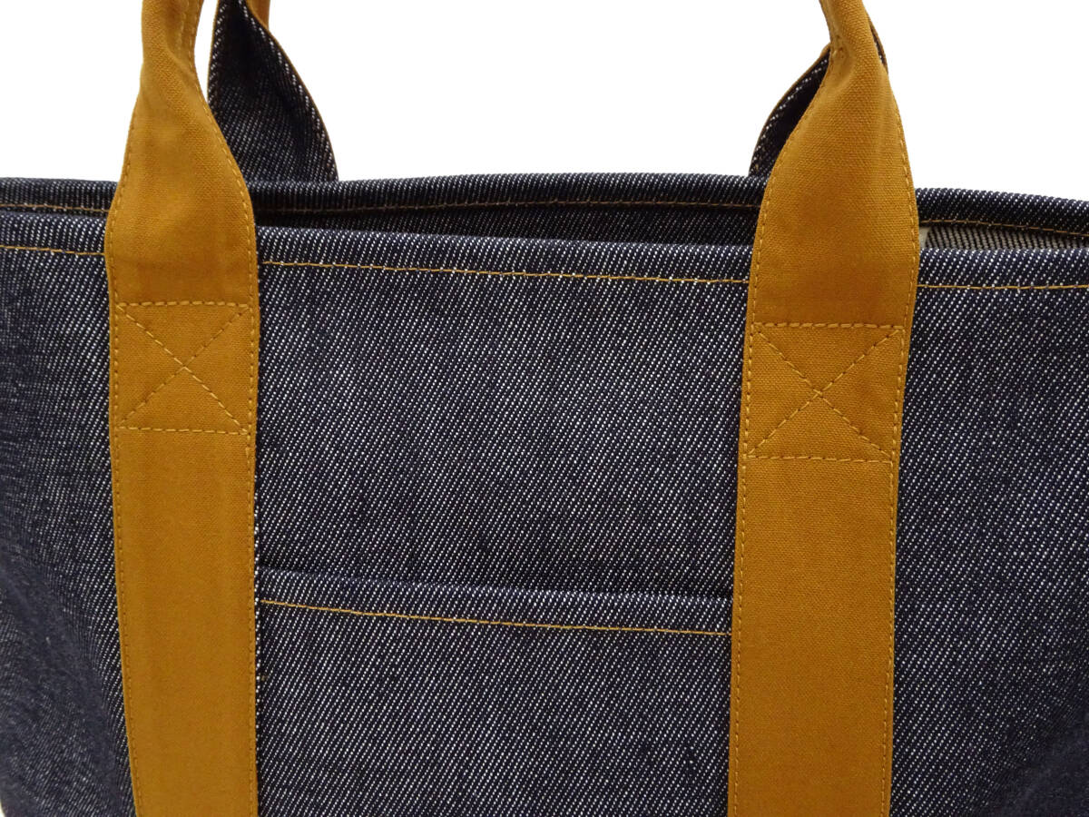 本体のデニムに生地に、ハンドルから底マチにかけてダック生地を貼ったコンボトートバッグです。