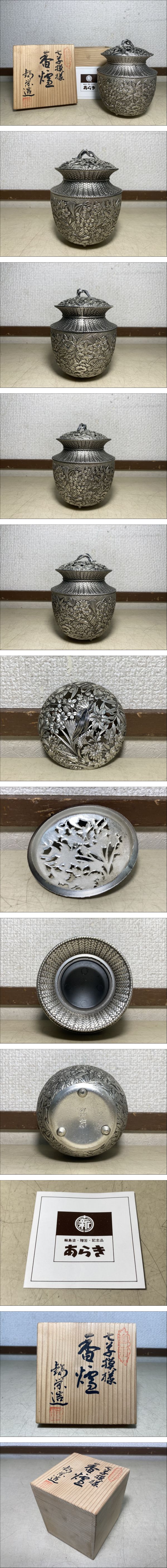 京都6☆ 香炉 七草模様 鍛栄造 銘有 高さ 約13cm 横幅 約9cm 重量547g 共箱付 現状品 煎茶道具 金属工芸 收藏