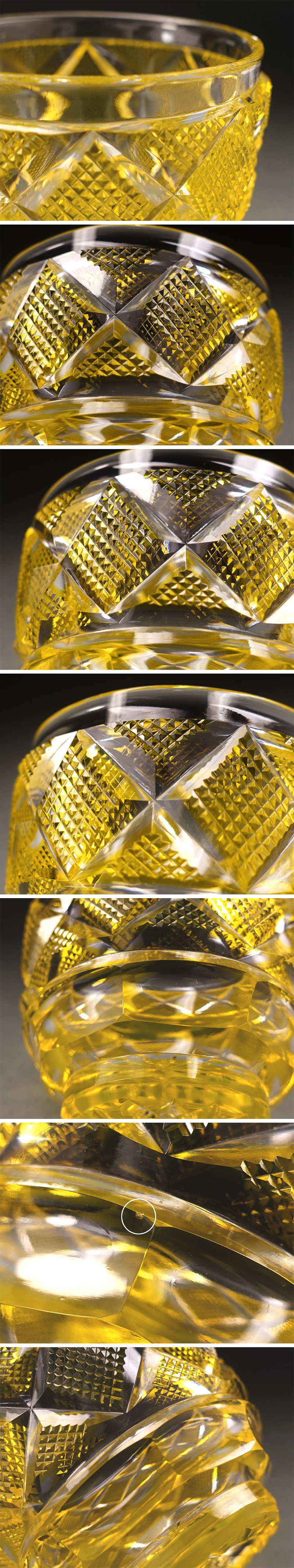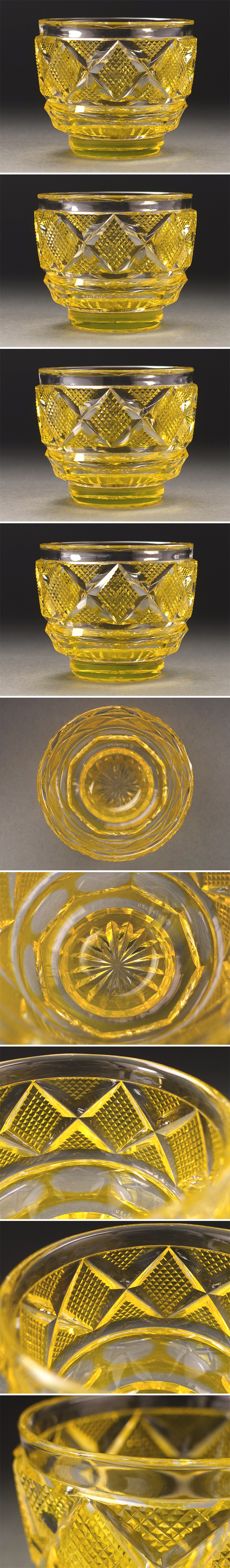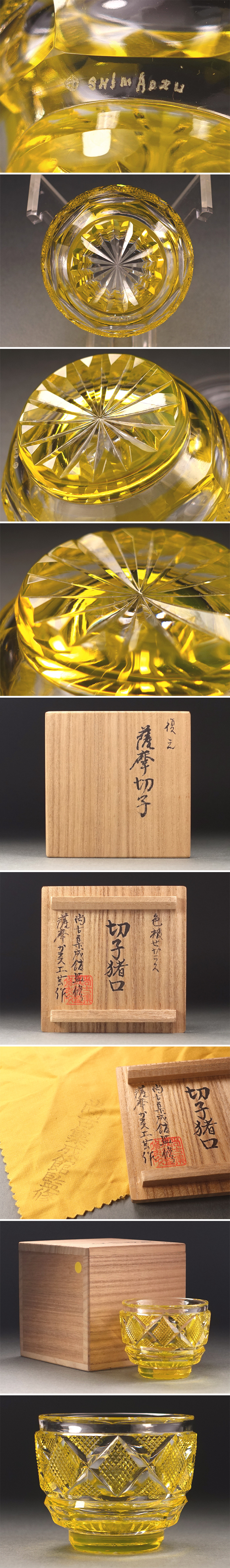 ∇花∇尚古集成館監修【薩摩ガラス工芸】作 復刻島津薩摩切子 黄色被せ切子硝子猪口 矢来魚子文酒盃 ぐい呑 共箱付 人気の黄色 收藏