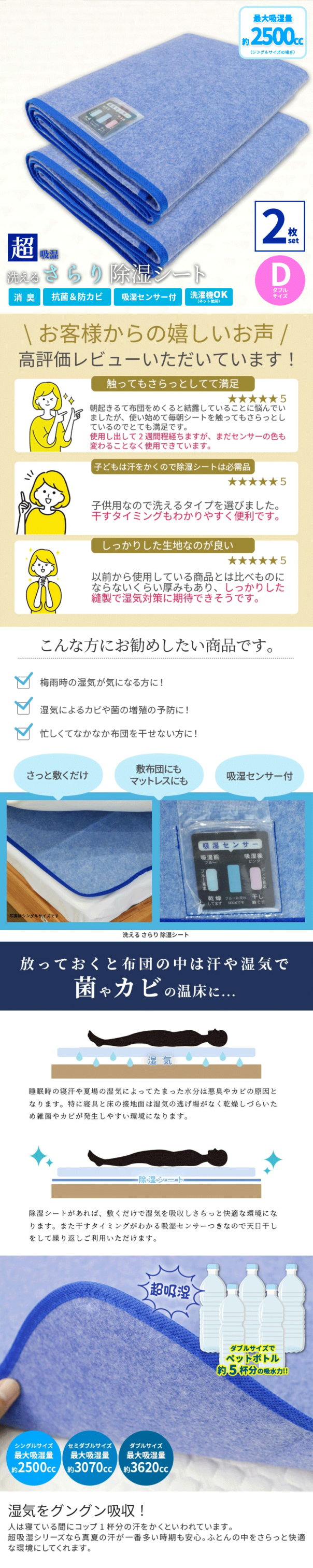 さらりと快適 洗える 除湿シート 2枚組 ダブル 湿気対策 防カビ 防臭 抗菌 130×180cm [2枚セット] ブルー 收藏