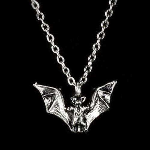 夜行性の悪夢の暗い意図とビジョンの控えめなシンボル。時代を超越した魅力を持つ繊細なゴシック クラシック。飛行中のコウモリの小さなピューター ペンダント。P158