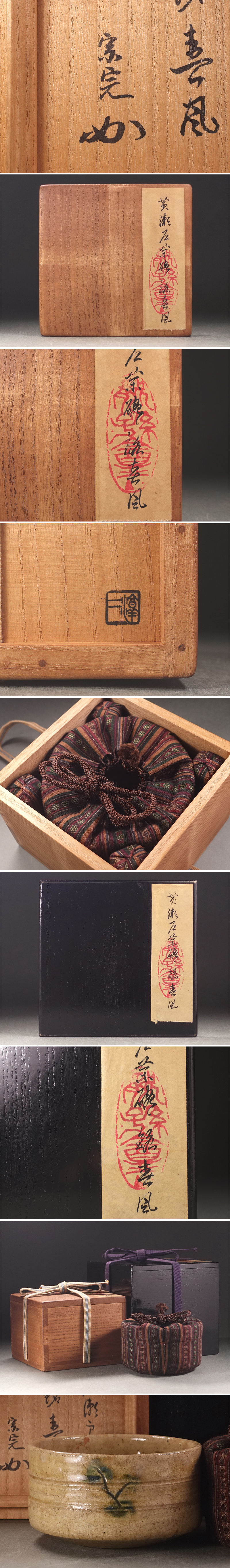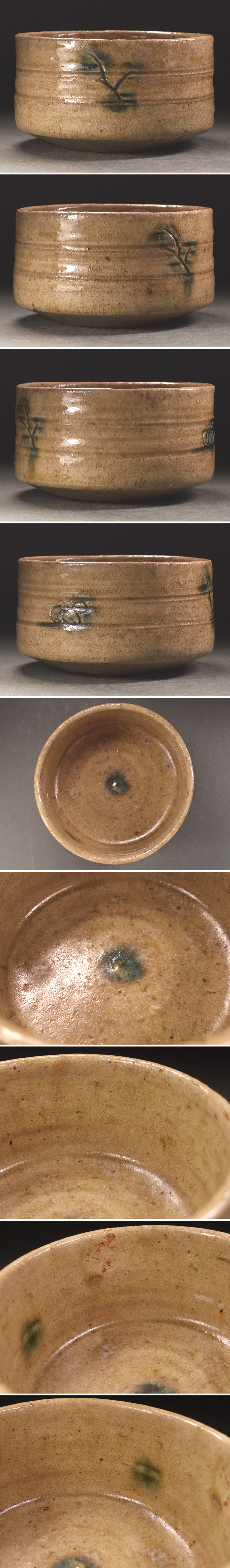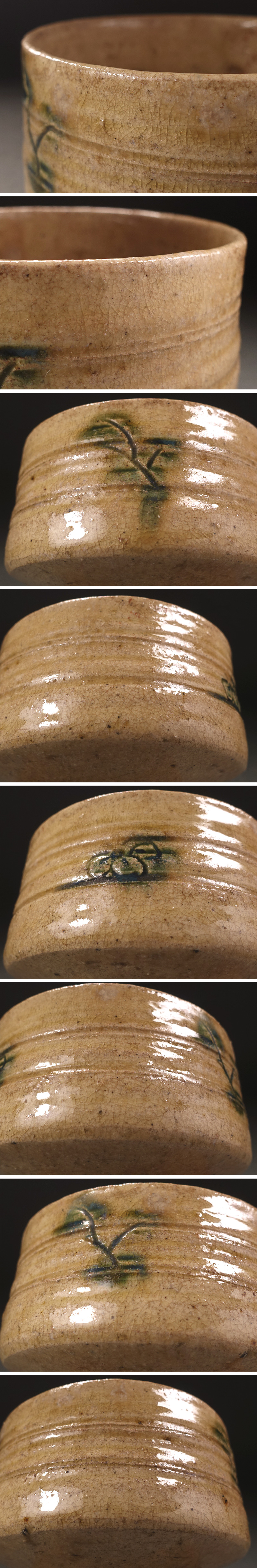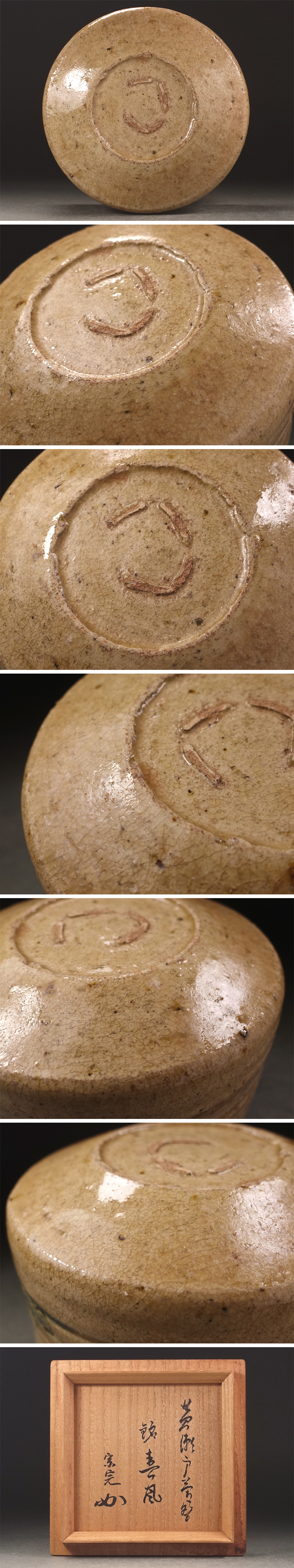 ∇花∇茶道堀内家十二世兼中斎御銘 江戸時代 黄瀬戸草葉彫文半筒茶碗 銘「春風」 碁笥底 兼中斎書附箱・二重箱・仕覆添 收藏