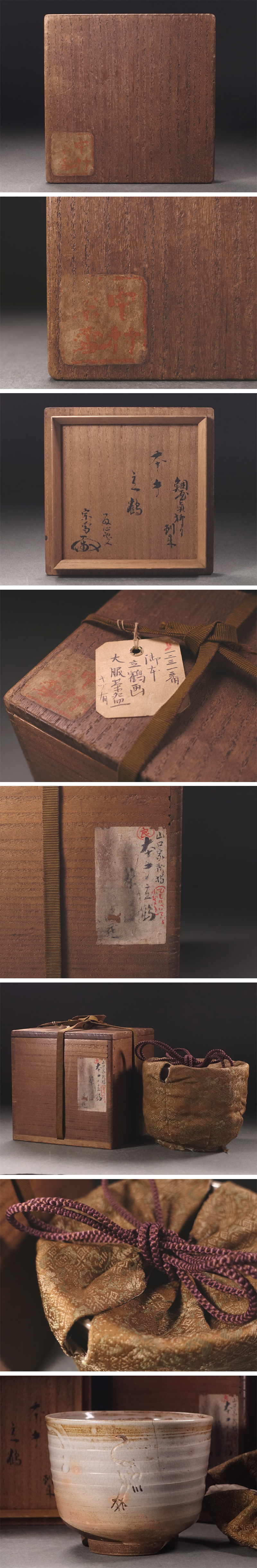 ∇花∇狂歌中興の祖・鯛屋貞柳伝来 李朝時代 本手御本立鶴茶碗 中村宗雪書付箱・古裂仕覆入 收藏
