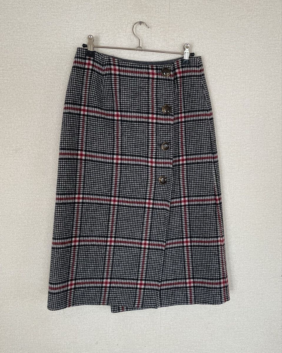 ウール混紡のグレーとチェック柄のリバーシブルロングスカート、5つのボタン付き。| 出价者 | 信用 | 价格 | 时间 |