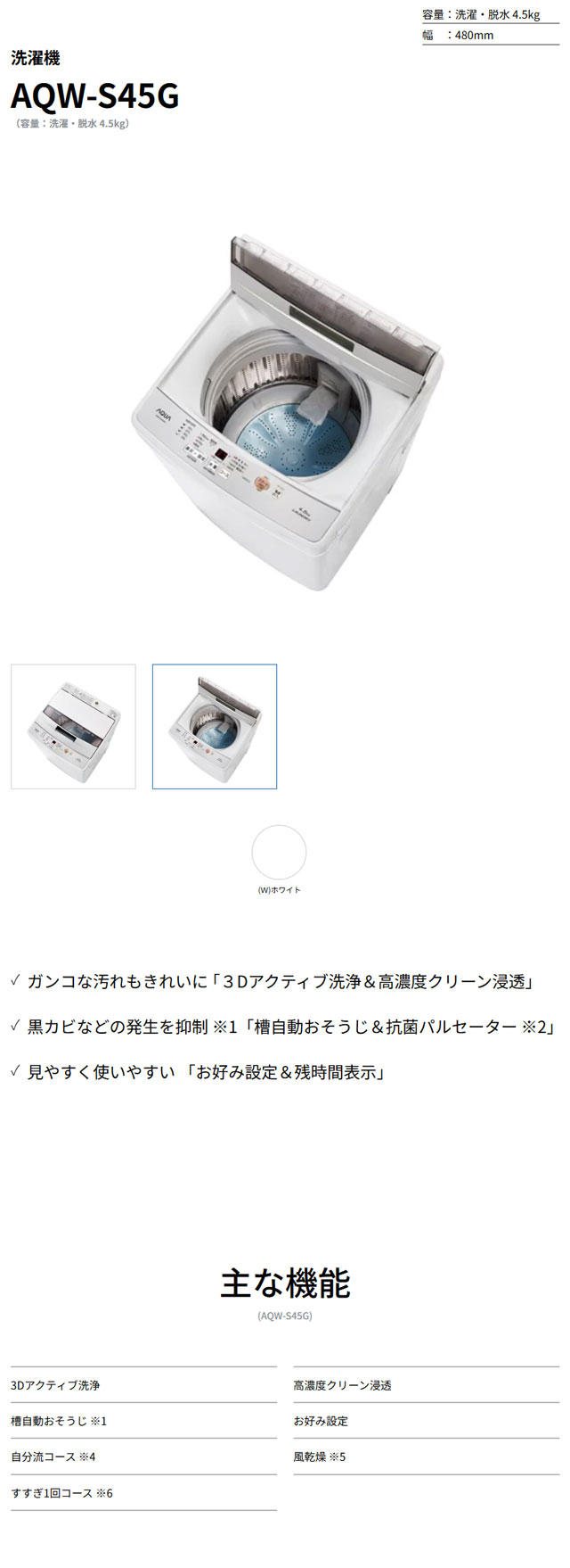 アクア 全自動洗濯機 AQW-S45G(W) 525x500x890mm 洗濯・脱水4.5kg 3Dアクティブ洗浄 高濃度クリーン浸透 槽自動おそうじ AQUA【長野発】 收藏