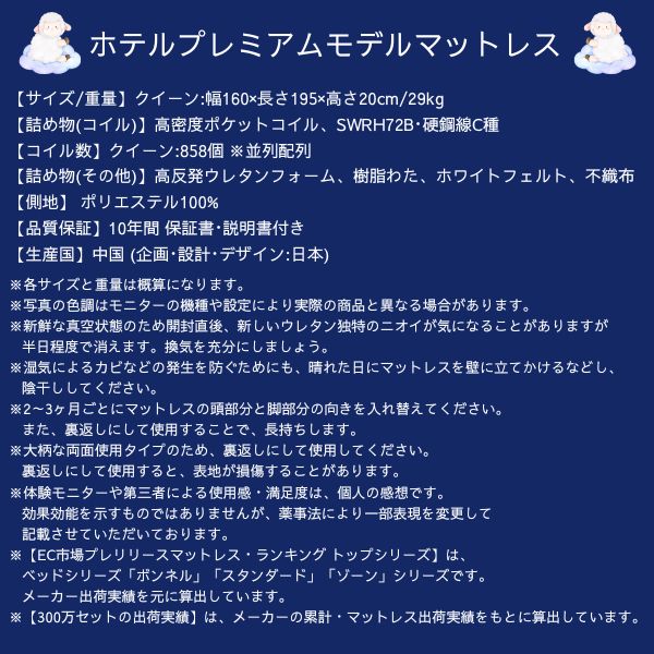 【10年保証】スプリングマットレス ホテルプレミアムモデル CospaSleep クイーン ホワイト 收藏