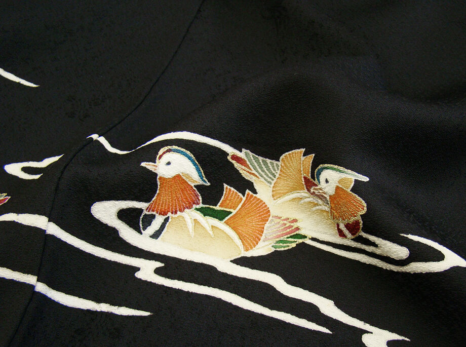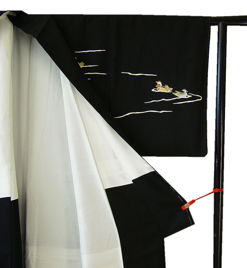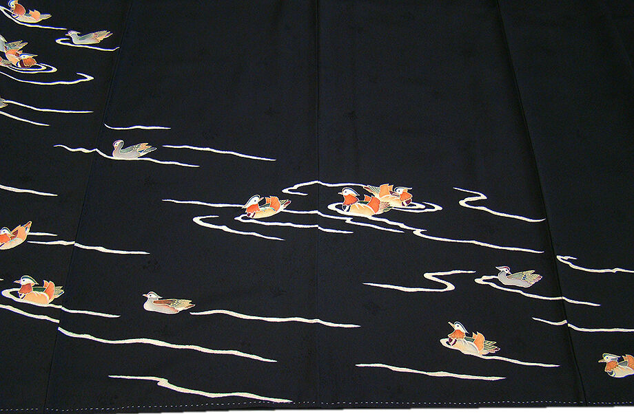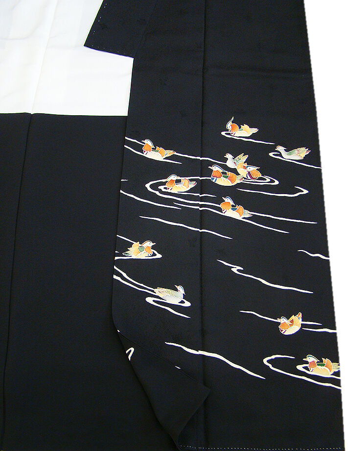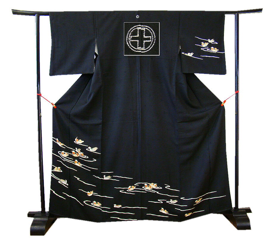 | 商品説明 | こちらのお品は「袷」でございますので、10月~5月までお召頂ければと思います。 しなやかな手触りの着心地良い重めのちりめん地の生地、 黒色地に地模様入りに水鳥、流水柄の本加工染に金彩加工仕立て、 八掛は共色に柄入り(正絹)、背に刺繍紋1ヶ、幅広い年代の方にお召頂けます。 |