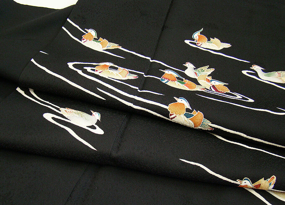 きものしらゆり 身丈155cm 裄63cm 10~5月 フォーマル ちりめん地 黒地 水鳥 本加工染 訪問着 正絹 身長148cm~154cmの方に最適 I365 收藏