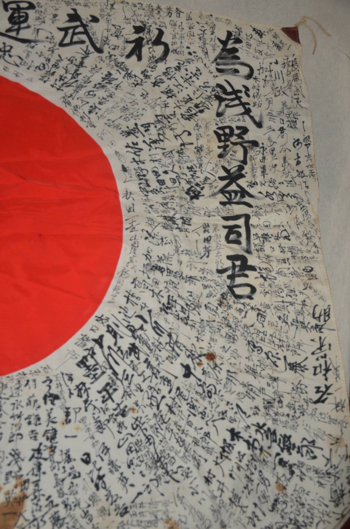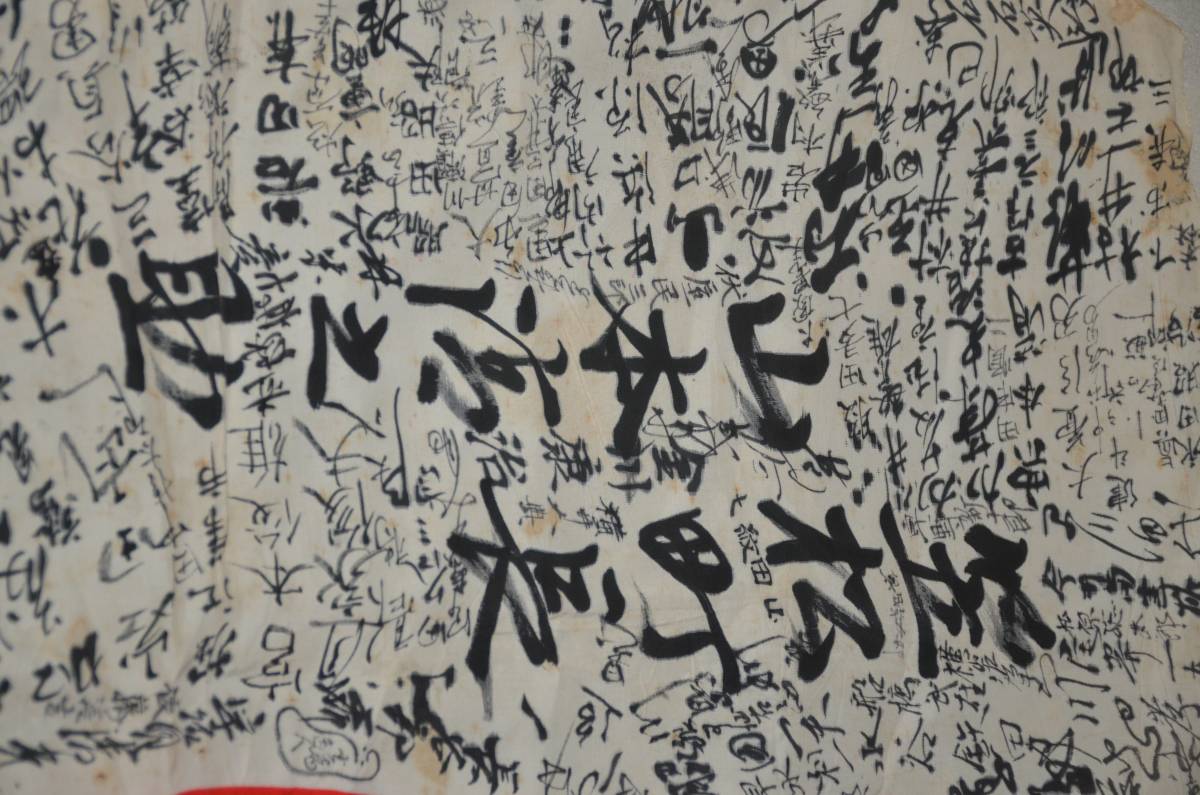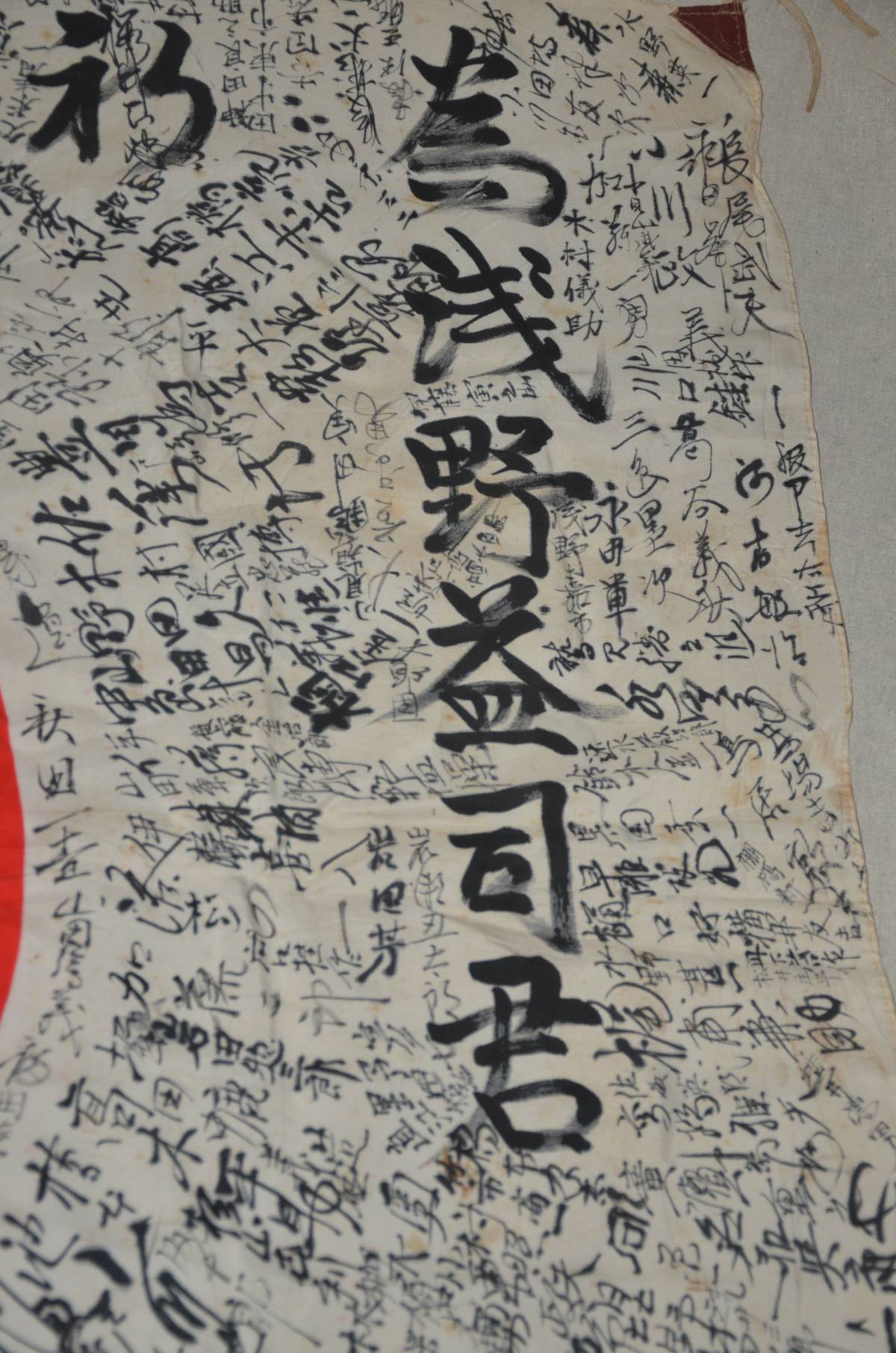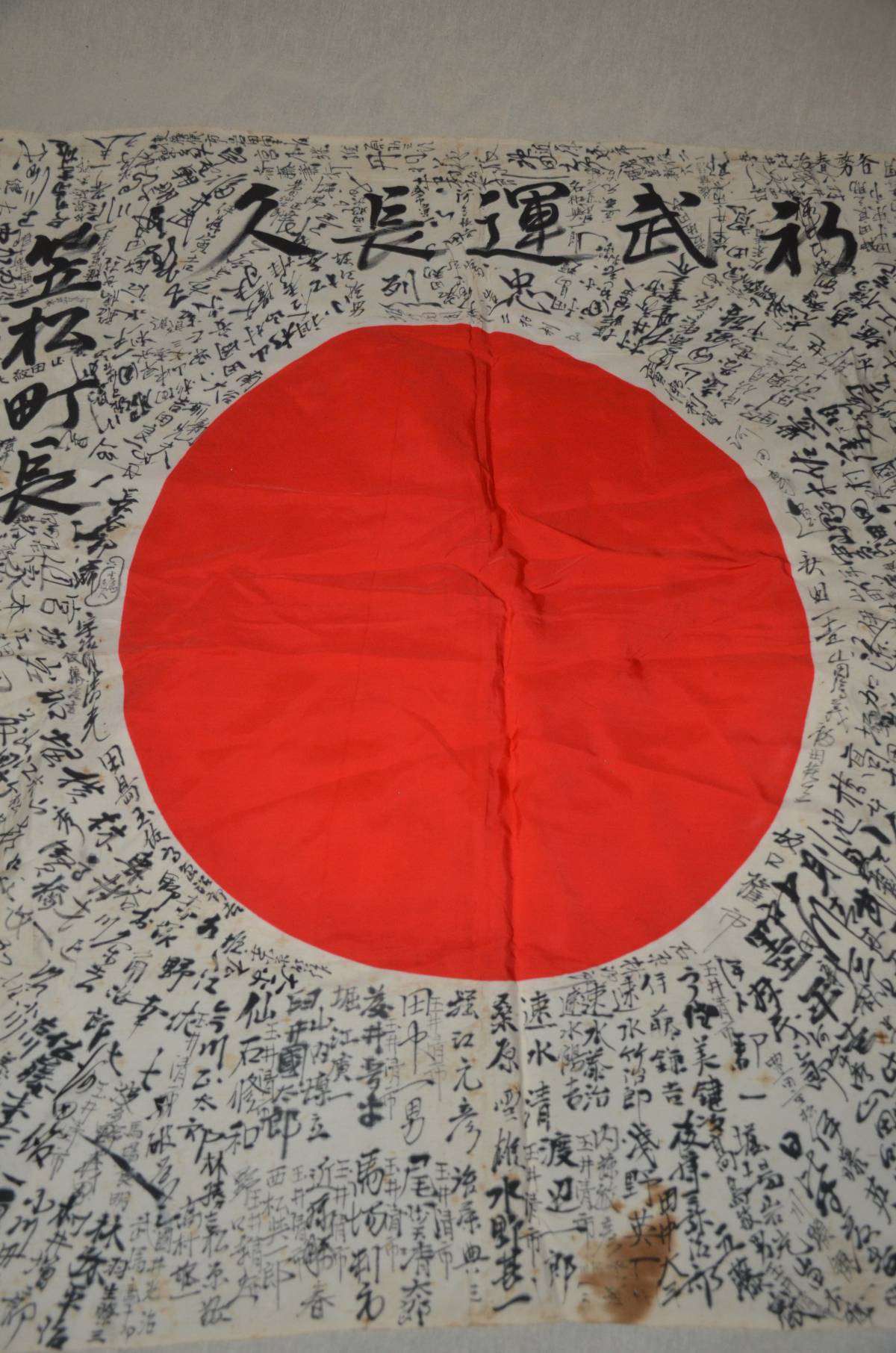 日の丸の寄せ書きです。岐阜県の笠松町長の署名があります。出征軍人への物で、非常に多数の署名があります。実家の保存品で、戦場御遺品ではありません。サイズは、73センチ×92センチです。本文下の追加写真もご覧ください。ヤマト運輸ネコポス便で、全国一律210円でお送りさせていただきます。