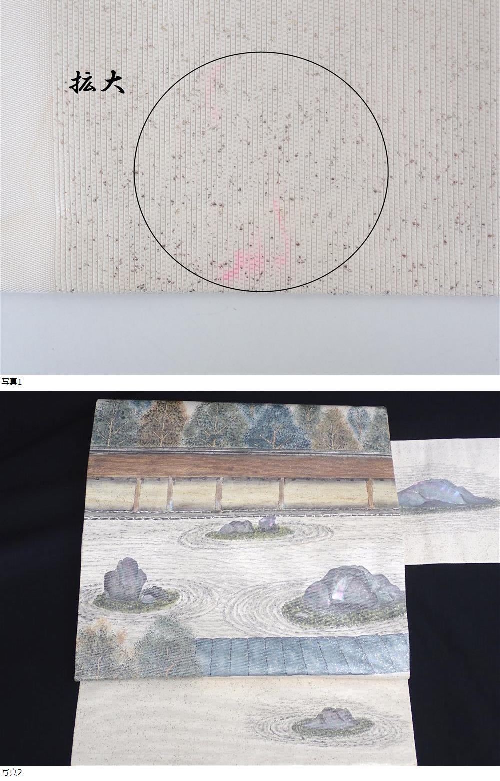 秀品 正絹 名古屋帯 日本庭園 螺鈿細工 31cm×356cm 薄たまご色 | ||||