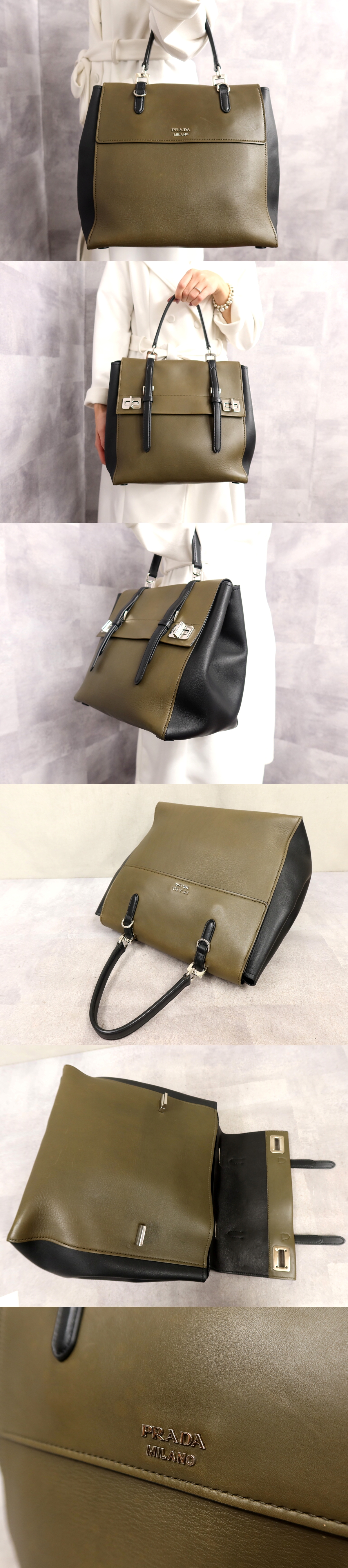 ●超美品●PRADA プラダ●オールレザー●カーフ レザー 本革●ハンド バッグ●ダークグリーン 黒●シルバー金具●イタリア製●B5●Js63101 收藏