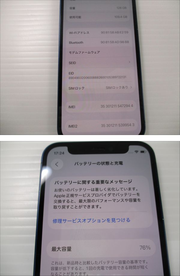 ※他 出品商品との「同梱発送不可」となります。 ※おまとめ依頼があった場合でも「個別取引」となりますので予めご了承くださいませ。 ※弊社指定の配送方法となりますので、配送方法変更不可となります。 (沖縄県は(60サイズ以上の商品)ゆうパックのみでの配送) ※領収書発行可能 (領収書は商品同梱となりますのでメール送信・別住所への郵送はできません) 領収書が必要な場合は、支払完了前までに取引ナビにてお知らせください。 ※落札より2日以上ご連絡が無い場合は「落札者都合でのキャンセル」となります。 ------------------------------------------------------------------------------------------- 【機種】iPhone12 mini 【キャリア】docomo 【容量】128GB 【型式】MGDP3J/A 【カラー】ブルー 【動作】通電確認済 ※充電可能/電源入ります(出品時) ※傷・汚れ有。長期保管の中古商品、現状でのお渡しとなりますので、画像にてご確認の上ご入札お願いいたします。美品・完品をお求めの方は入札をお控えくださいませ。 【バージョン】26.0.1 【IMEI】 ※利用制限(docomo):〇 【SIMロック】有 ※付属品につきまして、画像に写っているものが全てとなります。 ※アクティベーションロックは解除済みの商品となります。 ※商品の詳細につきまして、専門業者ではございませんのでお答えできかねる場合がございます。 ※状態に関して、経年劣化による、小傷や汚れ等はご了承くださいませ。 見落としがある可能性も御座いますので、詳細は画像にてご確認頂き、画像にてご判断頂ける方のみ御入札をお願い致します。 ※電化製品・精密機器等の保証はございません。 | |||