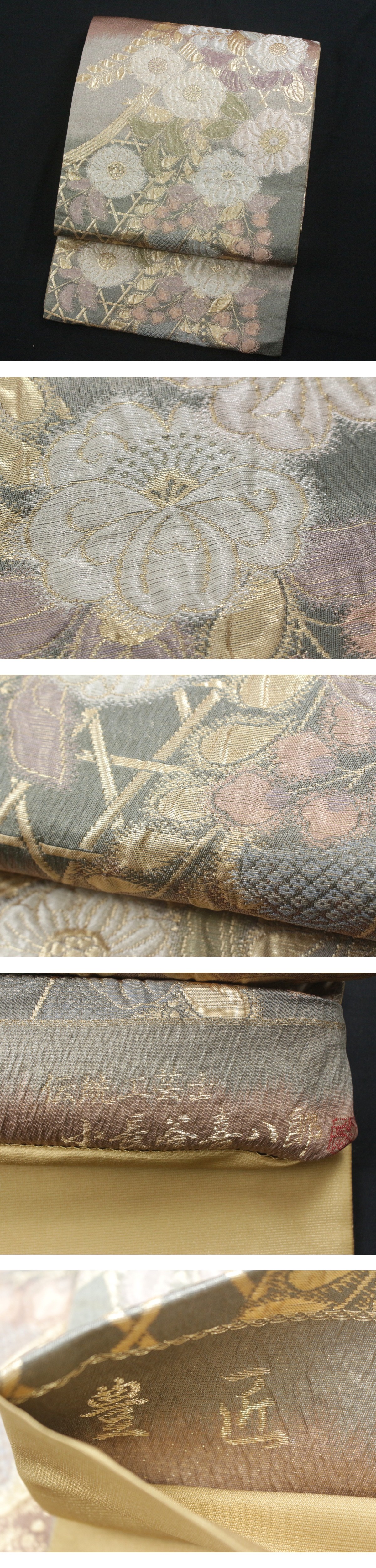 伝統工芸士 小長谷喜八郎による、辻が花文様の正絹袋帯のご紹介です。 小長谷喜八郎は、長年にわたり西陣織の第一線で研鑽を重ね、織と染の表情を巧みに融合させた作風で知られる匠。とりわけ、絵画的な構成力と繊細な色使いには定評があり、格調と詩情を併せ持つ作品を数多く手がけてきました。 本品は、辻が花ならではの幻想的な草花意匠を、やわらかな暈し調の地に配した一条。金糸を基調としながらも、白・淡藤・薄緑などの優しい色彩が溶け合い、華やかさの中に気品と静けさを感じさせます。花々や蔓葉の表現は立体感があり、見る角度や光によって豊かな表情を見せてくれるのも魅力です。 訪問着や付下げ、色留袖などのフォーマル寄りの装いに最適で、式典や改まった席はもちろん、格調を大切にしたお出かけにもおすすめ。辻が花の流麗な世界観を、帯として存分にお楽しみいただけます。 伝統工芸士の確かな技と美意識が息づく、格調高い正絹袋帯。装いに品格と奥行きを添える一本として、ぜひご検討ください。 ※撮影時の部屋の照明によって画像の色に若干の差がございます。色味に差がございますことをご了承のうえご検討下さいませ。 …状態… 締め跡あり。 ※全くの新品ではございませんので、記載のない変色やスレ、ヤケ、その他僅かな難がある場合がございます。そのような理由でのキャンセルはお受けできませんので、ご了承の上ご検討お願いいたします。 |