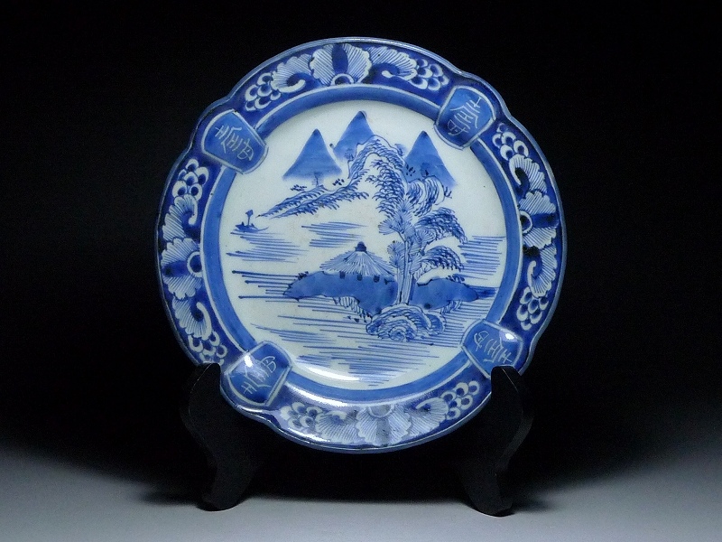8022H01*12B▲古伊万里 染付楼閣山水壽文字文中皿 直径約21cm 飾り皿 長寿 縁起物 收藏