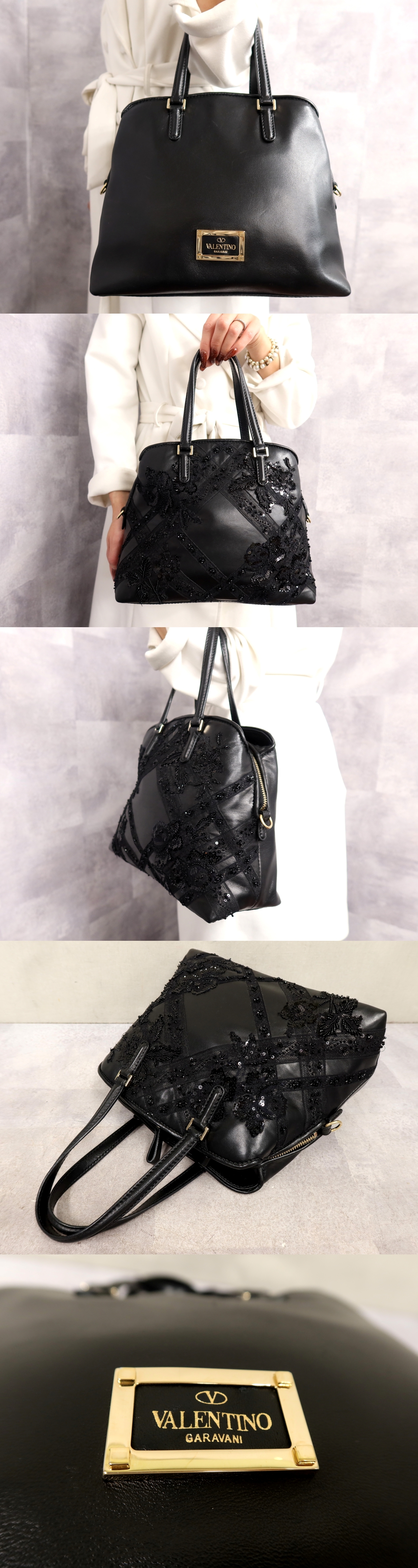 ●超美品●VALENTINO GARAVANI ヴァレンティノ ガラヴァーニ●ビーズ スパンコール●ラム レザー 本革●ハンド バッグ●黒●G金具●Js64015 收藏