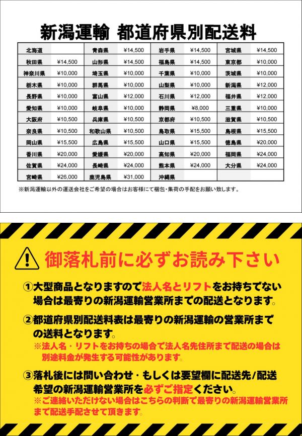 | 送料 | ■配送会社 新潟運輸※同梱不可 ★直接引き取り大歓迎 保管場所【静岡県富士市】 ※積み込みのお手伝いはさせて頂きますが梱包資材等は落札者様でご準備下さい ※注意※ 個人宅への配送はできませんのでお近くの営業所までになります 法人名がございますようでしたら落札後お知らせ下さい。 パレットに載せての発送となります。 ■営業所検索https://www.niigataunyu.co.jp/ ※北海道・沖縄・離島は発送不可となります。 ※お届けの際ドライバーはワンマンでお伺いします。荷下ろしにフォークリフト、クレーン等が必要です ※安全の為ドライバーはお手伝いできません 保管場所 | 工具一番館 富士店 〒417-0071 静岡県富士市国久保3丁目8-11 | |