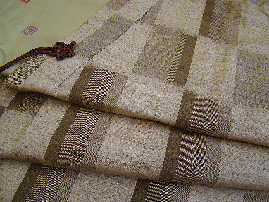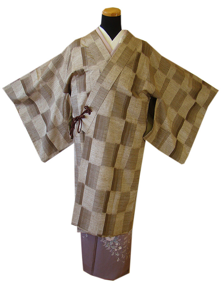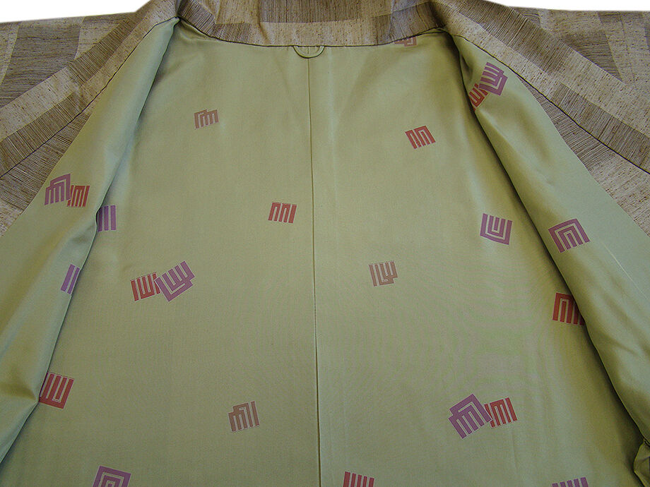 | 商品説明 | とてもしなやかなふっくらとした手触りの着心地良い ふしやぼそも味わい深いぜんまい紬地のロング道中着。 茶系のグラデーション地の織柄。 肩裏も正絹。 |