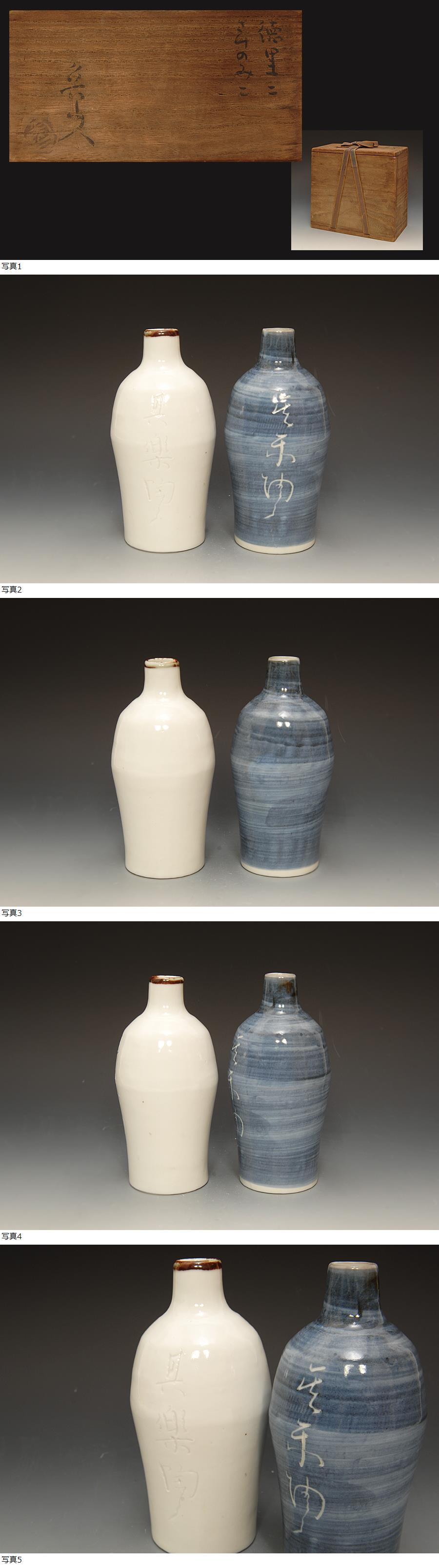 ご覧のような魯山人の展覧会等には必ず出店される代表的な染付描銘の完璧な上がりの作品です。共箱作品ですが(酒呑 二)とありますが徳利一対のみの作品です。