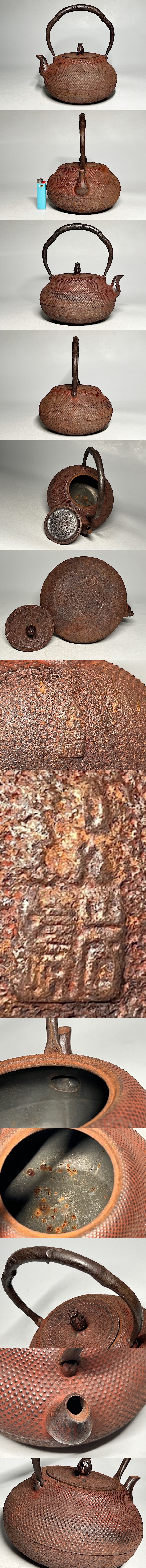 南部岩躊作 霰文 鉄瓶 高:22.4cm ◆商品詳細 寸法(約):22.6x19.7(提手までの高×注ぎ口まで幅㎝) 蓋重さ:164g 総重量:1574 g ※寸法に若干の誤差が生じる場合もございます。 水を24時間はりもれませんでしたが、 のちのご使用による水もれ、破損は保証できませんので、ご承知ください。 経年の汚れ、サビ、作成時にできたカタのへこみや、スジ、膨らみがあります。 底や、中の状態も含めて画像で確認の上各自の判断で入札お願いします。 上手な直し(釜補修)があった場合、見ただけでは当方もわかりませんので、 あると思って承知して入札して下さる方が良いと思います。 ◆発送先等のご連絡とお支払いについて ※発送先等のご連絡 落札時から48時間以内にお願い致します。 ※お支払 かんたん決済の期限内にお願い致します。 。※複数点落札時にまとめて取引の場合(72時間内)に、 まとめて取引の取引手順(落札者方の操作)を参考にお願い致します。 梱包したサイズを測って、地方によって送料を決めますので、よろしくお願いします。 ◆掲載画像について ※画像は現物を撮影しておりますが、照度、遮光、モニターによっては実物と 色目が異なって見えることがありますのでご注意ください。掲載画像では確認 できない傷や汚れがある可能性もございます、あくまで中古品であるというこ とをご承知の上、御入札をお願い致します。 ◆補償について 商品到着後はすぐに状態の確認をお願い致します。 商品の破損等がございまし たら、箱や梱包材など全てそのままの状態で保存し、お早めにご連絡ください。 (到着日から一週間以上経過、梱包材の廃棄済み等の場合、保証は致しかねます のでご注意ください。) ◆返品について 思っていたイメージと違う、などのお客様主観による返品はお受けできません ので、予めご了承ください。ノークレーム、ノーリターンでお願いします。届 いた商品が商品説明と著しく乖離している等、当店に原因のある場合には、お 早めにご連絡ください。 ◆注意事項 当方の希望価格と隔たりがある場合は、終了前にやむなく取下げさせて頂く場 合がございます。 ※商品ご落札翌日から4日間以内にご連絡が取れない場合は、入札取消の処置を 取らさせていただく場合がございます。 ※評価の悪い方は取り消す場合がございます。 ※原則として当方の不備以外のキャンセル・返品・返金は受け付けておりません。 以上の点を予めご了承頂いた上で、入札・落札お願い致します。 ◆発送方法 ▼ゆうパック(補償あり/追跡あり) 梱包後のサイズ:~80cm ※送料全国一律1,200円 (但し北海道、沖縄、離島は+500円いただきます。) 発送元は静岡県となります。 ( 商品の組み合わせによっては同梱をお断りさせていただく場合があります。) ※大型商品について 郵便局の規定を超える商品の場合は、佐川急便またはヤマトでの発送となります。 |