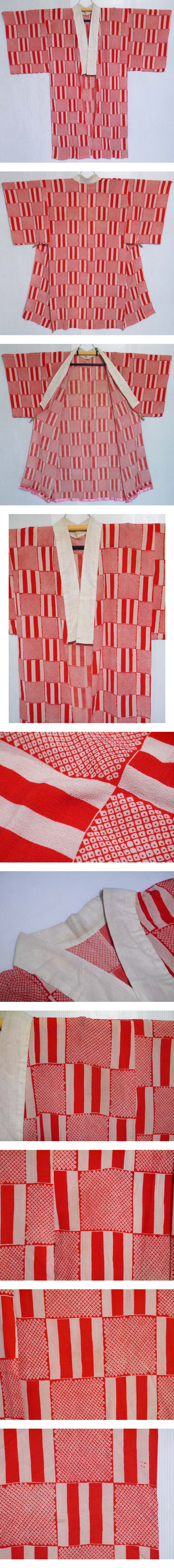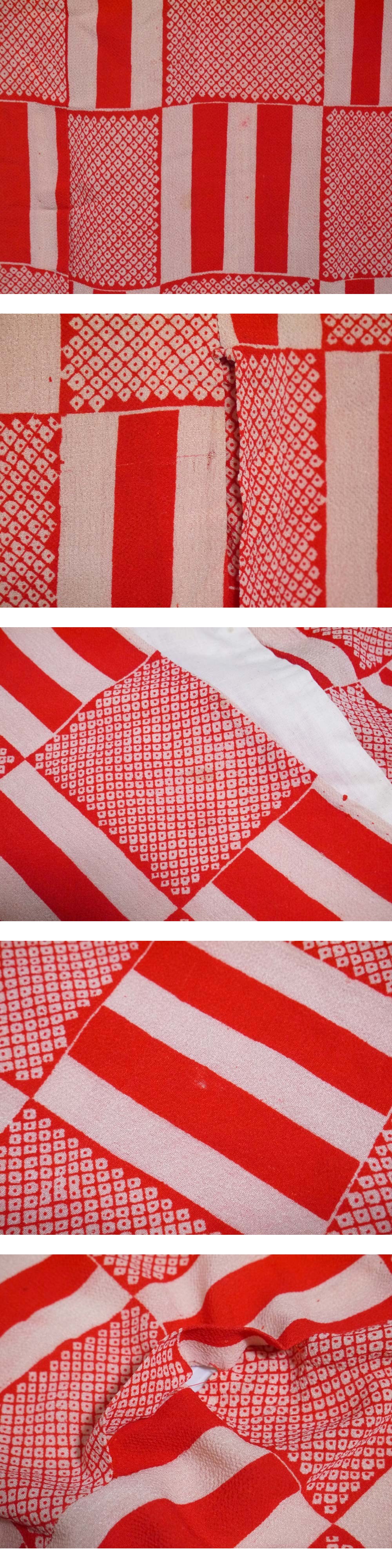 【KIRUKIRU】アンティーク 長襦袢 正絹 縮緬 ちりめん 大正ロマン 赤×白 紅白 市松 鹿の子 ストライプ 古布 古裂 リメイク 材料 人形細工 收藏