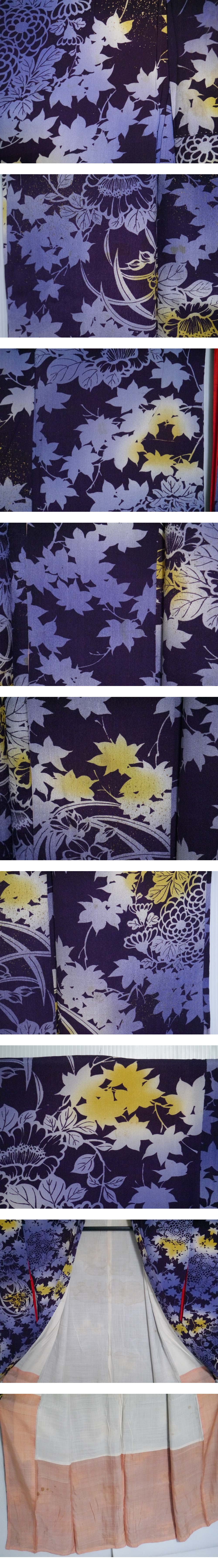 【KIRUKIRU】アンティーク 着物 正絹 錦紗 大正ロマン 濃淡紫×黄 月夜の植物 レトロ 古布 古裂 リメイク 材料 生地 收藏