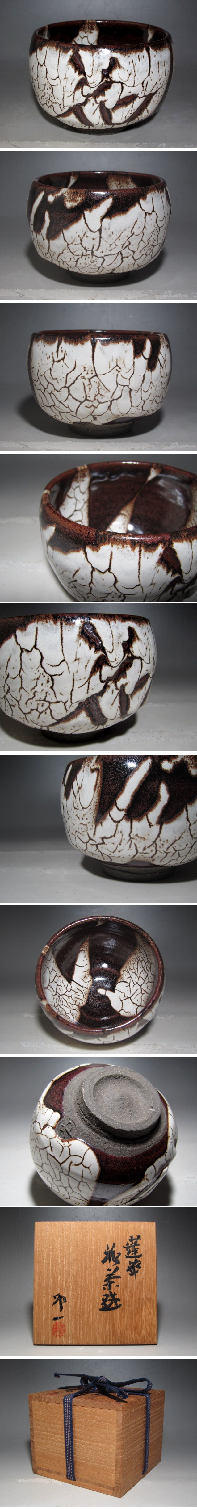 人間国宝清水卯一作の蓬花茶碗です。 味わい深い景色の見事な出来栄えの逸品です。 【清水卯一(しみずういち)1926-2004】 京都出身の昭和後期-平成時代の陶芸家。 石黒宗麿に師事し、中国の鉄釉や柿釉を研究し作品を日本伝統工芸展で発表し注目された。 ブリュッセル万国博でグランプリなど海外でも評価された。 滋賀県志賀町に蓬莱窯を築く。 1985重要無形文化財(人間国宝)に認定された。 1986紫綬褒章を受章した。 サイズ 直径12cm/高さ8.5cm(多少の誤差はお許しください) 状態 一見して疵やヒビ・直しは見られません。 骨董品という事をご勘案頂き、時代経過のスレや、小さな傷がある場合があるかもしれませんのでご承知置きください。 | |||