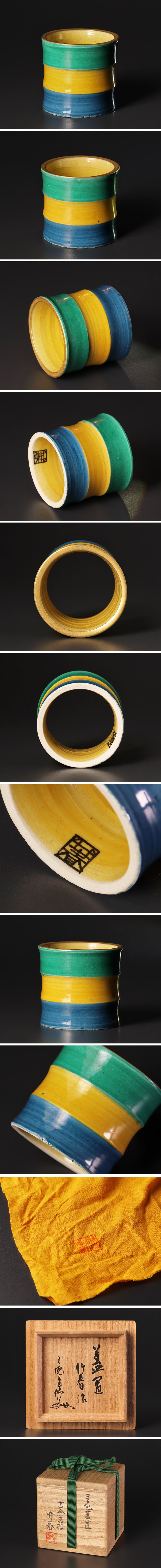 三色の彩りが重なり合い、堂々とした佇まいが際立つ蓋置です。縁にあしらわれた金彩が上品にきらめき、味わい深い趣を添えています。 ★商品は川瀬順一(竹春)造・田中仙翁書付の作品である事を保証致します。 |