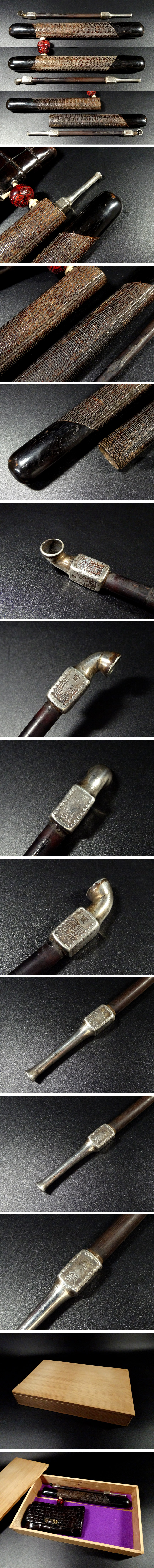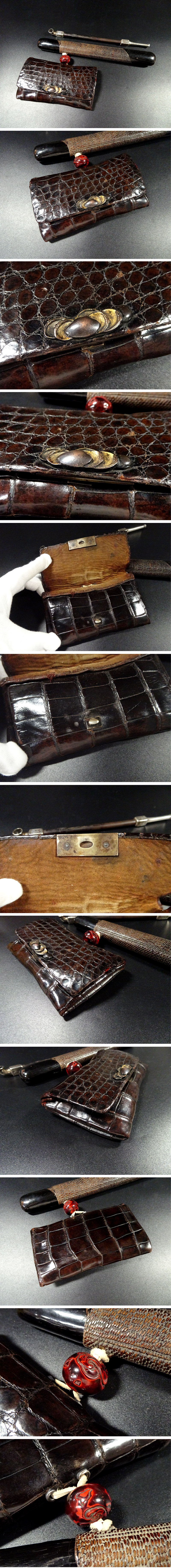 敬逢 時代 提物 大角斑 本クロコ革造 金色絵 蛤図金具 煙草入れ 紙縒造煙管筒 一朱銀銀無垢煙管 堆朱大玉緒〆 TAB-7 收藏